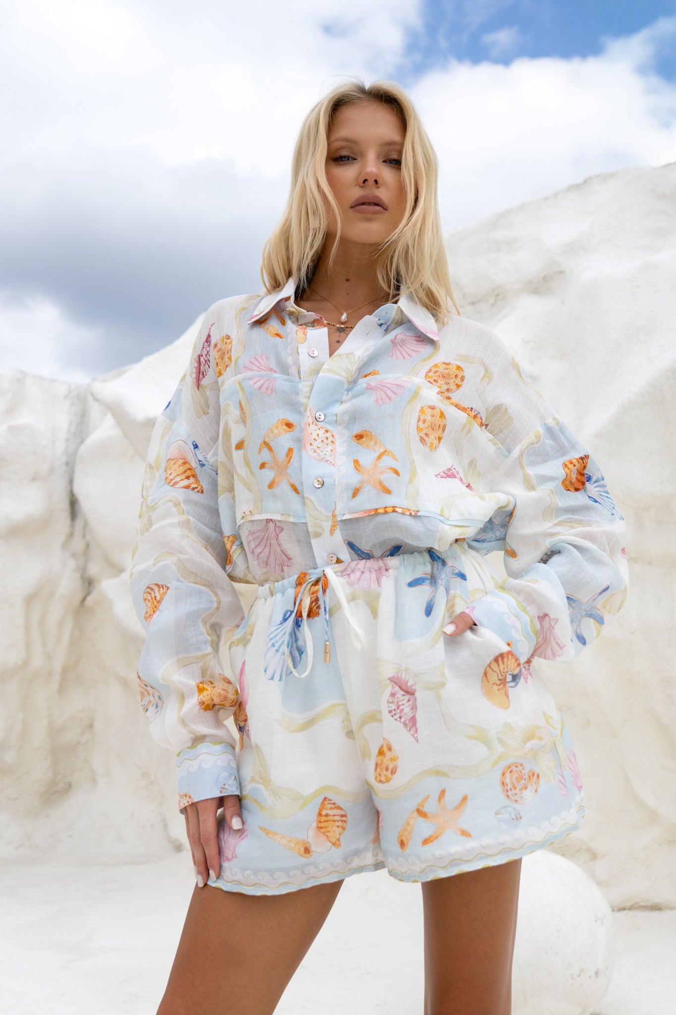 The all-over seashell print brings a painterly charm, with hues of soft coral, seafoam, lilac, and sand layered across a cloud-like background. The elastic waistband (with a drawstring, thank you very much) makes them as easy to wear as they are to style. Toss on a tank, a bikini top, or their perfect match, the Neri Shells Multicolour Abstract Ramie Shirt, for a head-to-toe look that says “I’m on holiday,” even if you’re just heading to brunch.