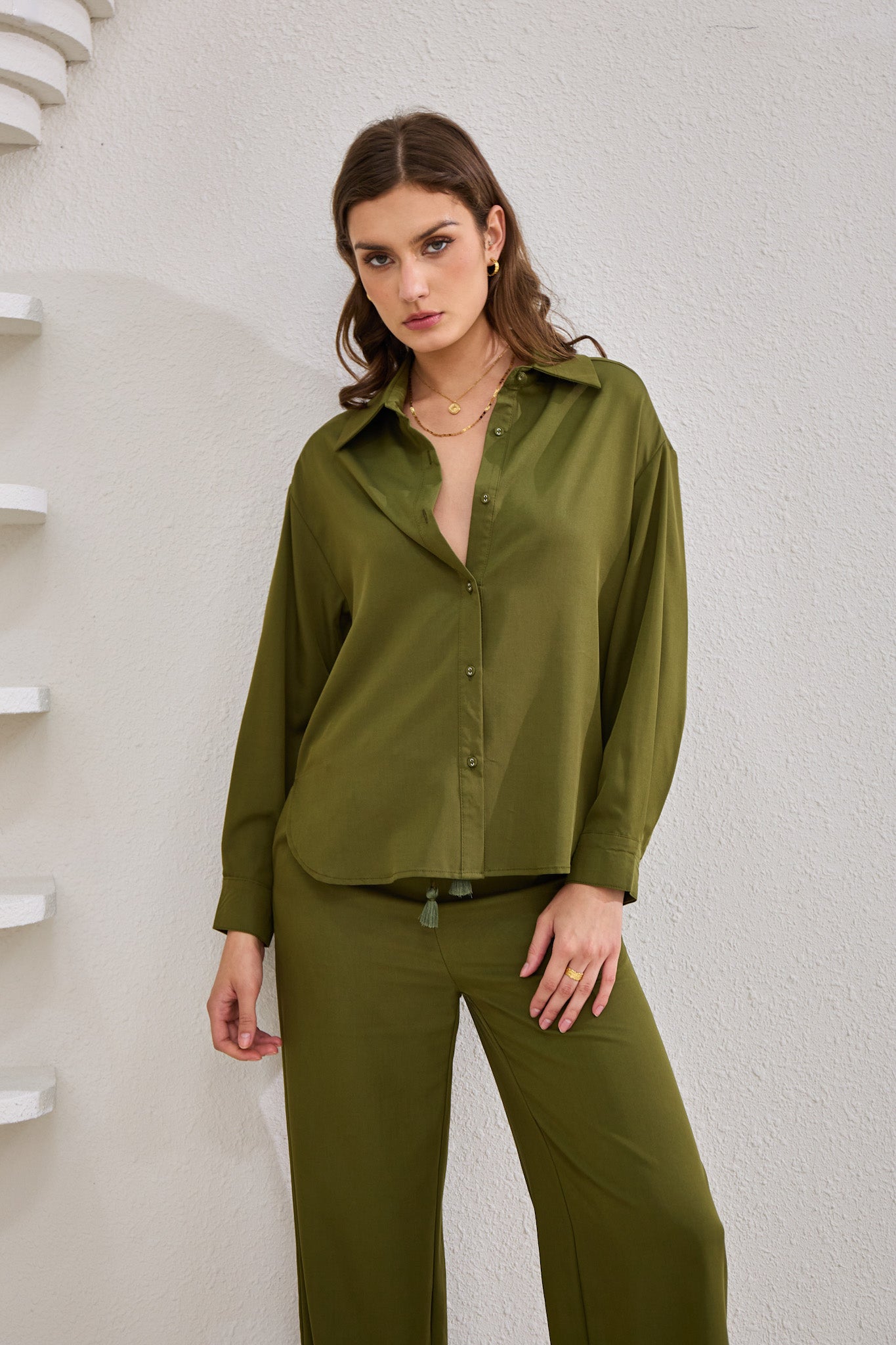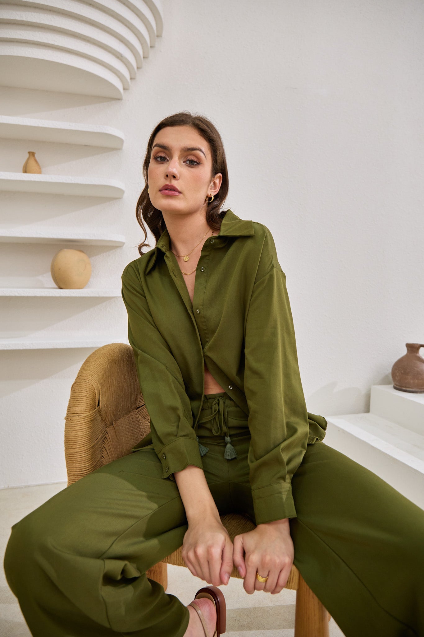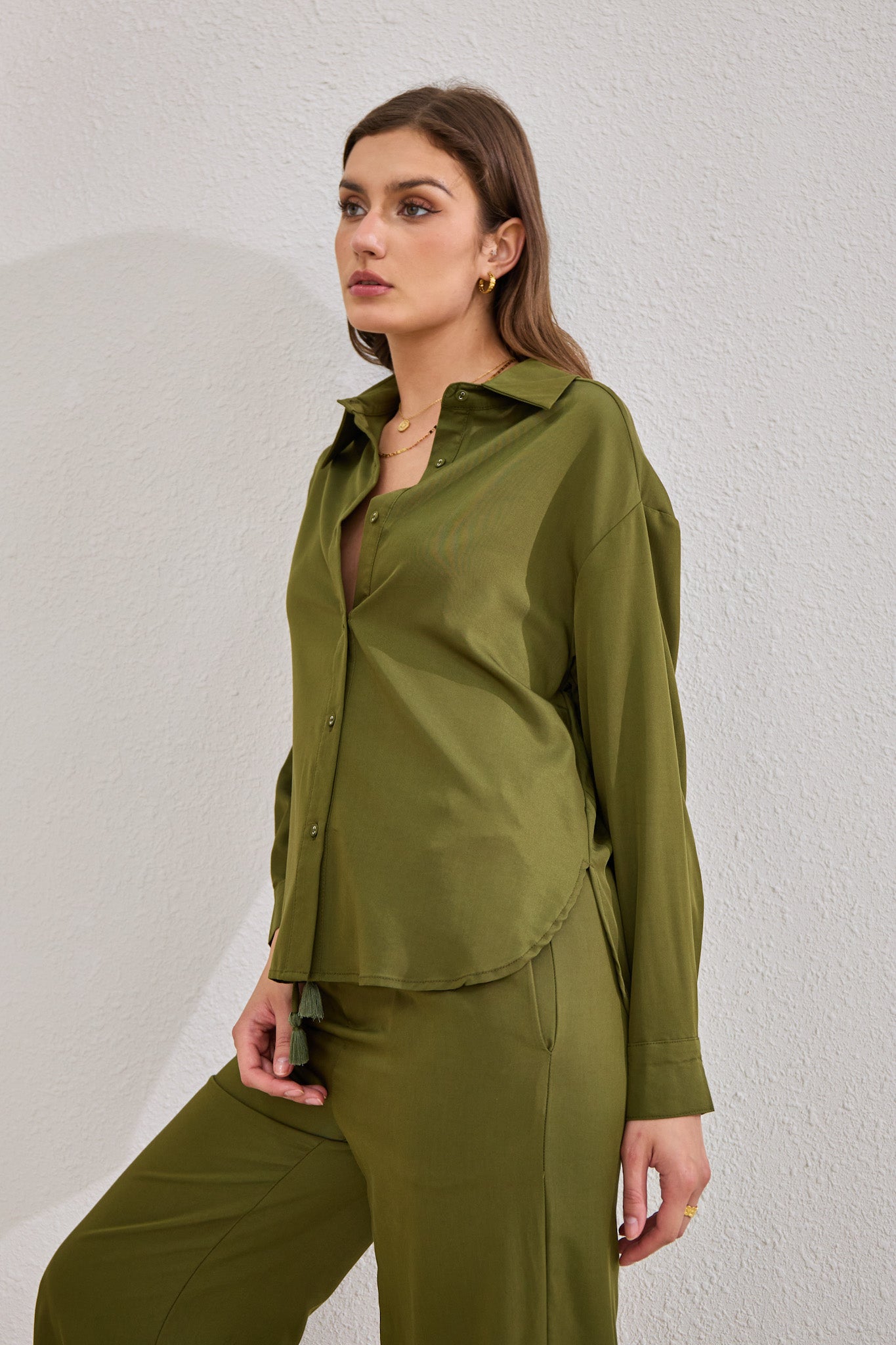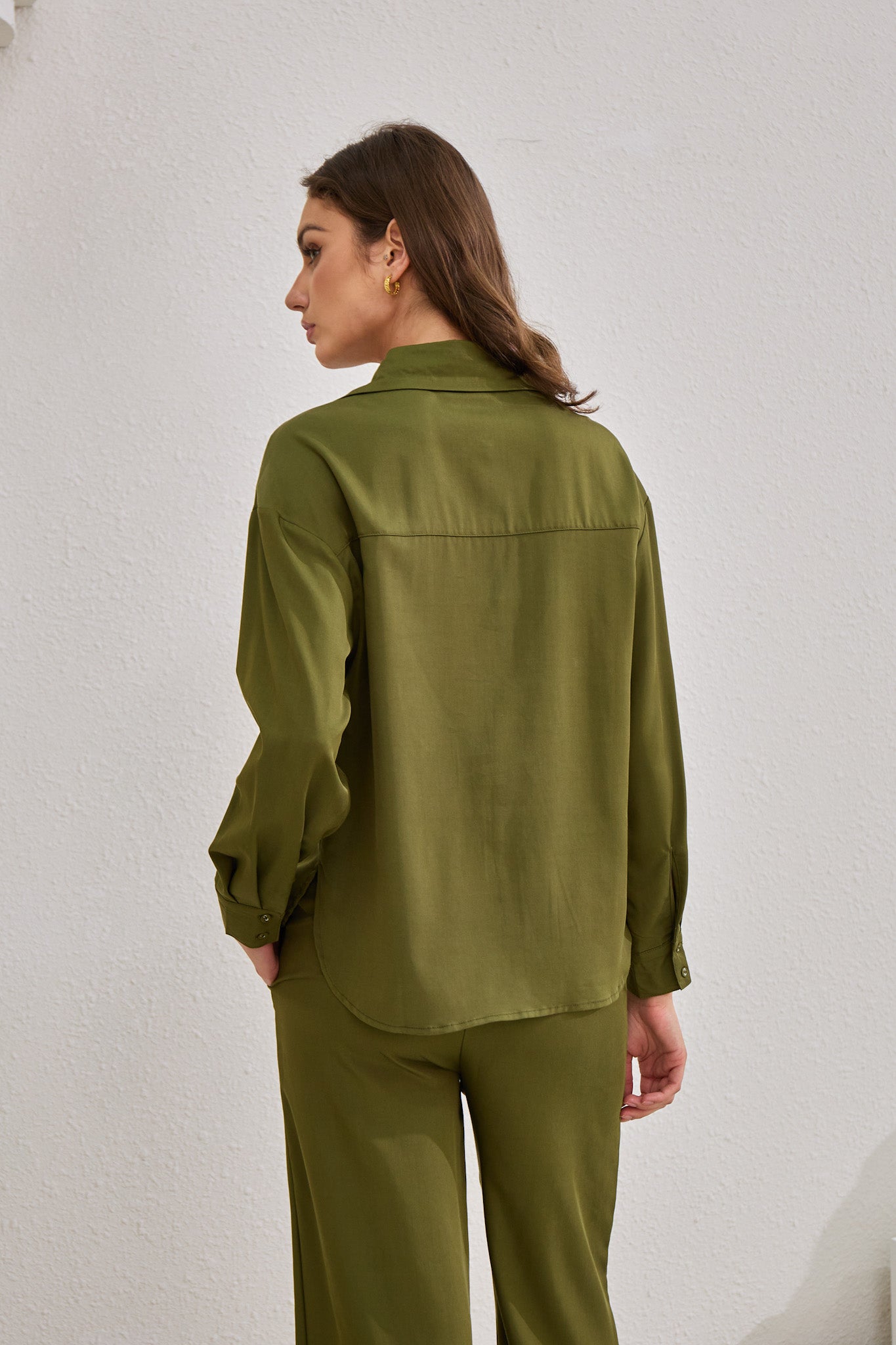 Experience effortless elegance with the Page Khaki Green Cupro Shirt. Designed with a classic collared neckline and a functional button-down front, this shirt blends traditional style with modern sophistication. The long sleeves feature stylish buttoned cuffs, complemented by a contemporary drop-shoulder design that adds a relaxed touch. Crafted from a soft, luxurious Cupro blend, this shirt offers a silky-smooth feel, making it both comfortable and chic. In a khaki green hue, it's a versatile piece that can transition seamlessly from the office to casual outings, ensuring you look polished on any occasion. Pair it with the matching Page Cupro Pants for the complete look.