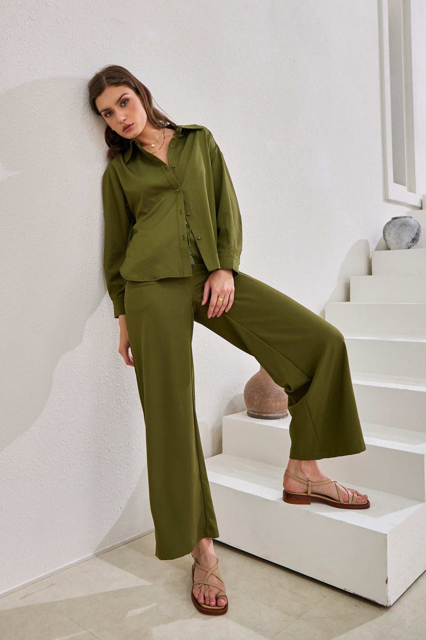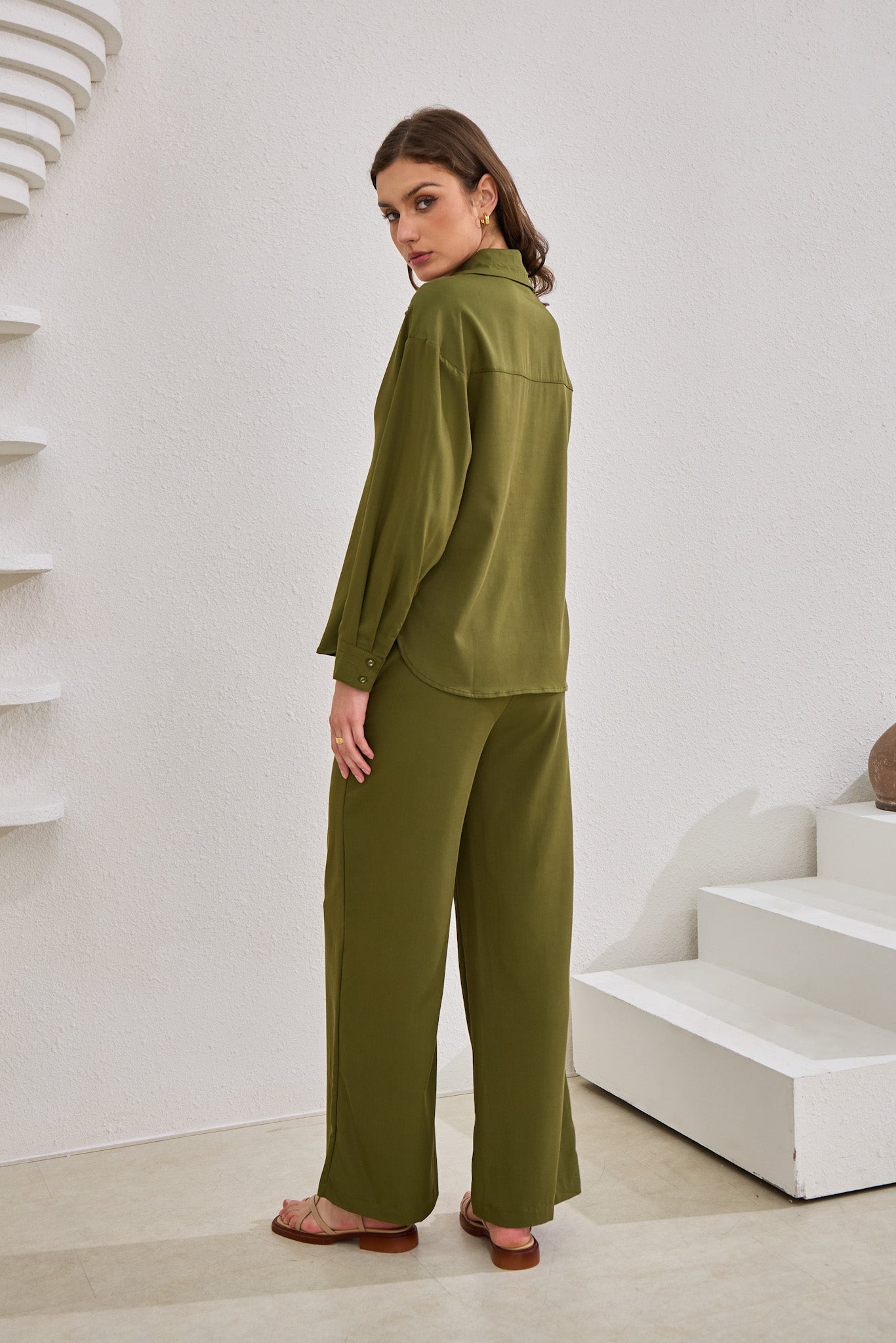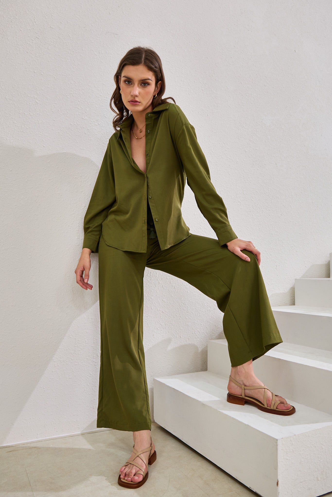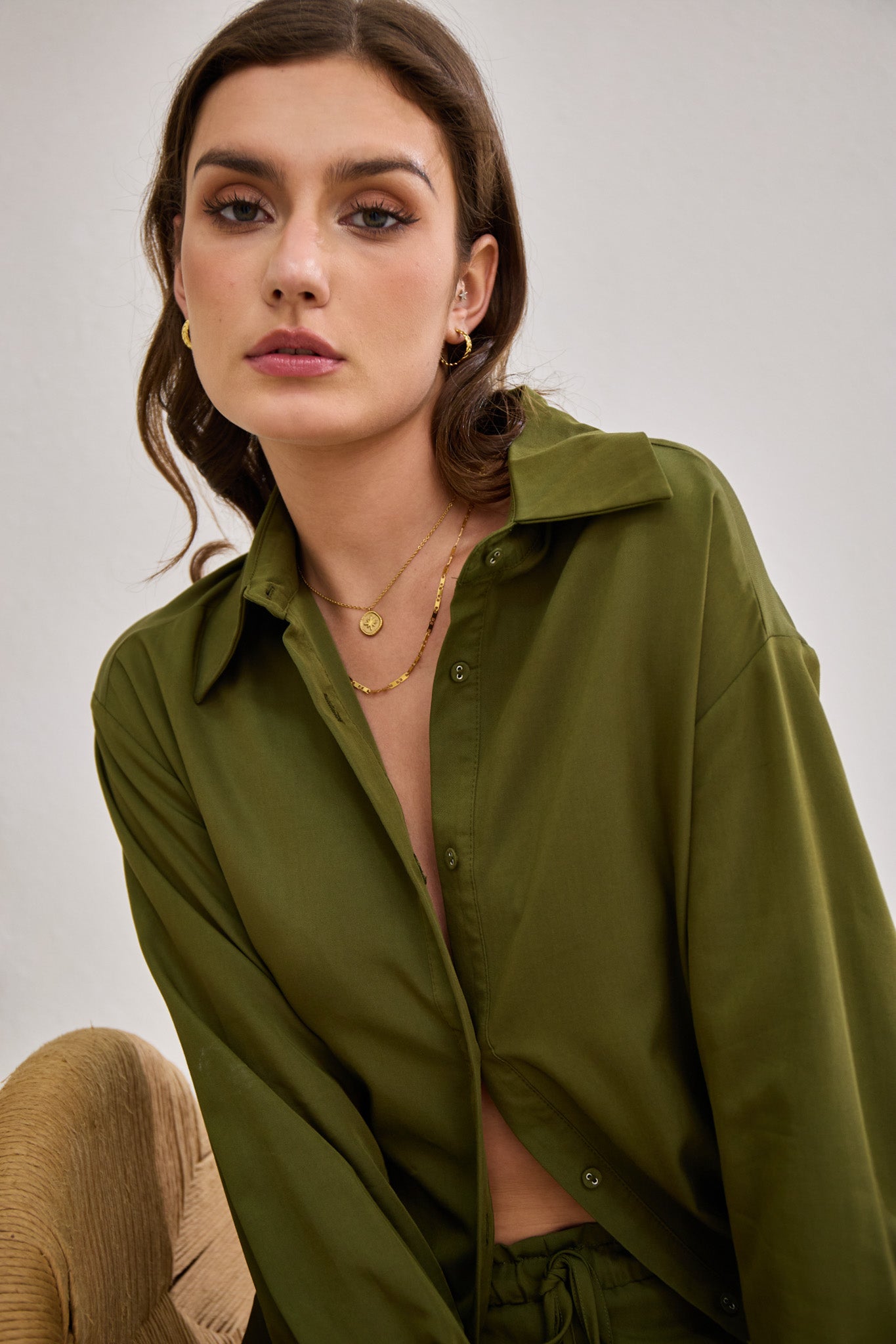 Experience effortless elegance with the Page Khaki Green Cupro Shirt. Designed with a classic collared neckline and a functional button-down front, this shirt blends traditional style with modern sophistication. The long sleeves feature stylish buttoned cuffs, complemented by a contemporary drop-shoulder design that adds a relaxed touch. Crafted from a soft, luxurious Cupro blend, this shirt offers a silky-smooth feel, making it both comfortable and chic. In a khaki green hue, it's a versatile piece that can transition seamlessly from the office to casual outings, ensuring you look polished on any occasion. Pair it with the matching Page Cupro Pants for the complete look.