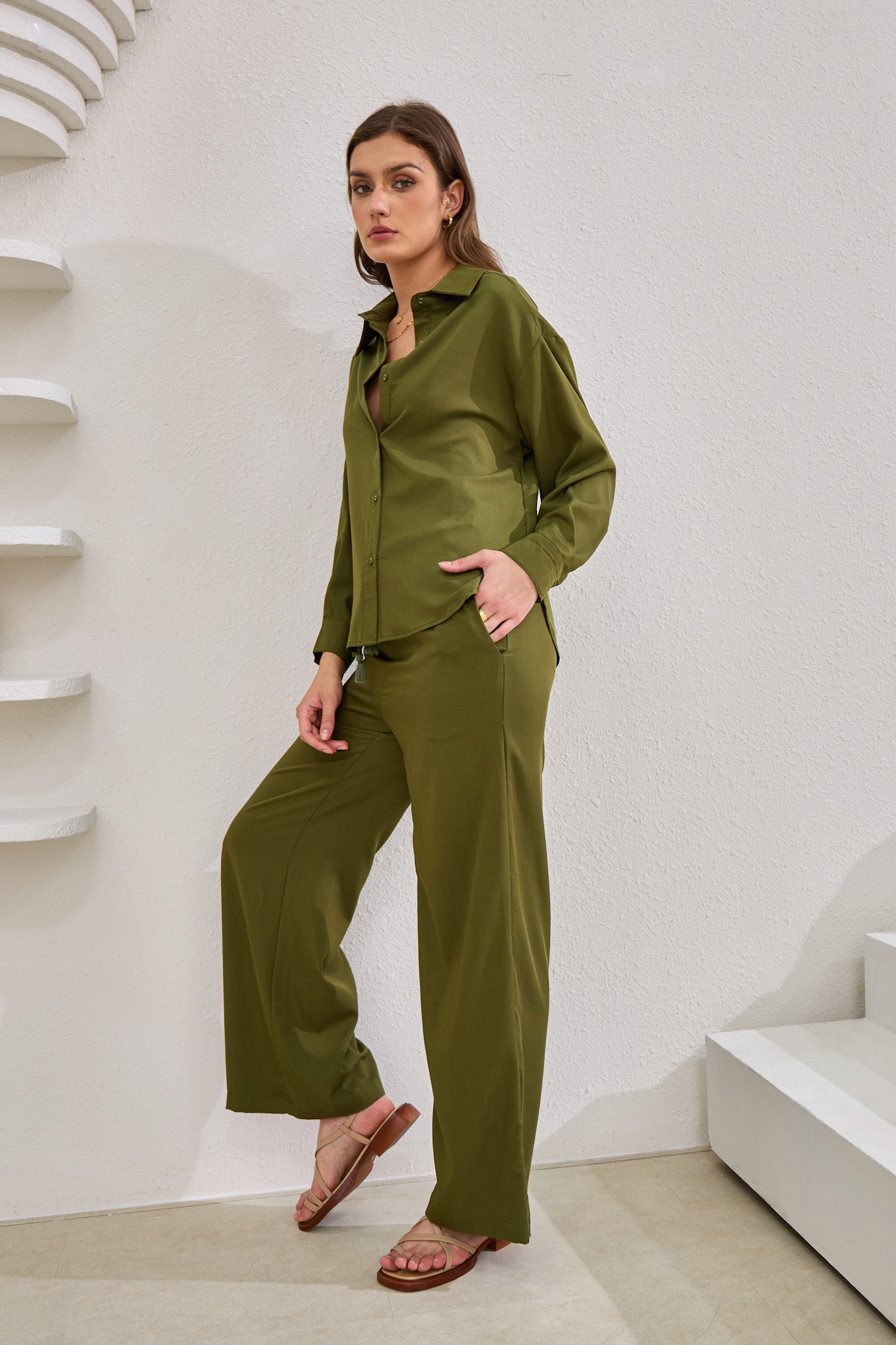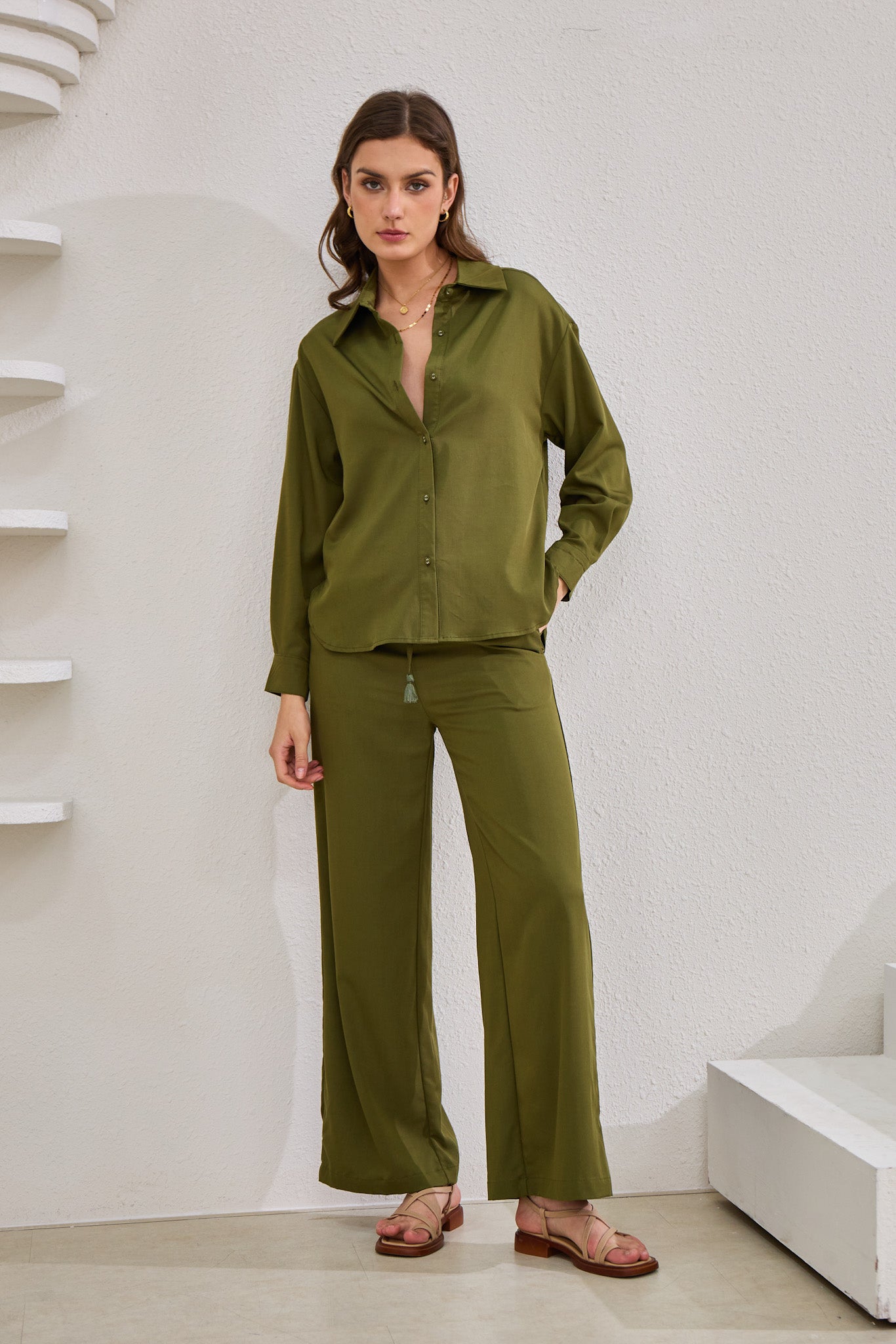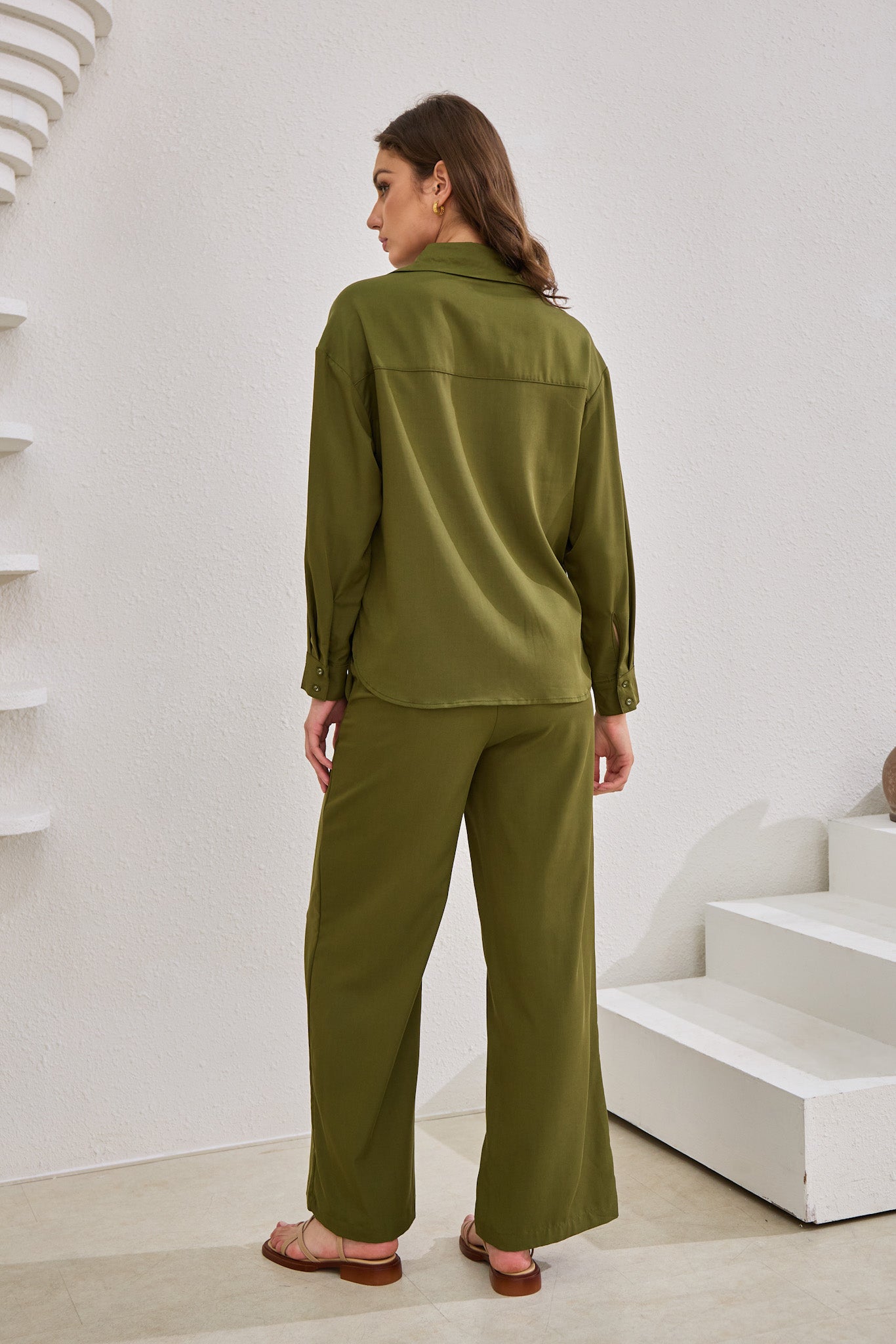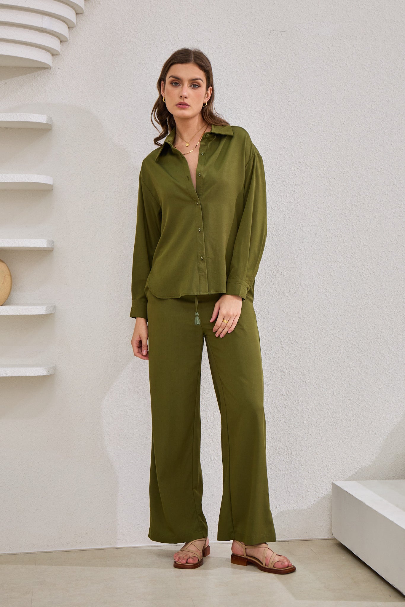 Experience effortless elegance with the Page Khaki Green Cupro Shirt. Designed with a classic collared neckline and a functional button-down front, this shirt blends traditional style with modern sophistication. The long sleeves feature stylish buttoned cuffs, complemented by a contemporary drop-shoulder design that adds a relaxed touch. Crafted from a soft, luxurious Cupro blend, this shirt offers a silky-smooth feel, making it both comfortable and chic. In a khaki green hue, it's a versatile piece that can transition seamlessly from the office to casual outings, ensuring you look polished on any occasion. Pair it with the matching Page Cupro Pants for the complete look.