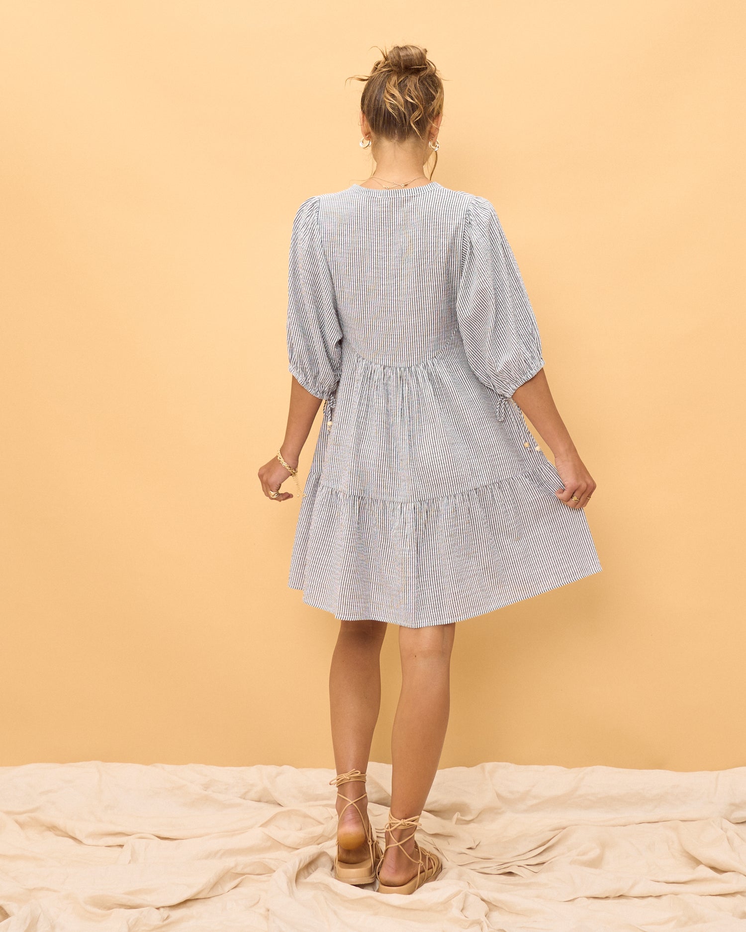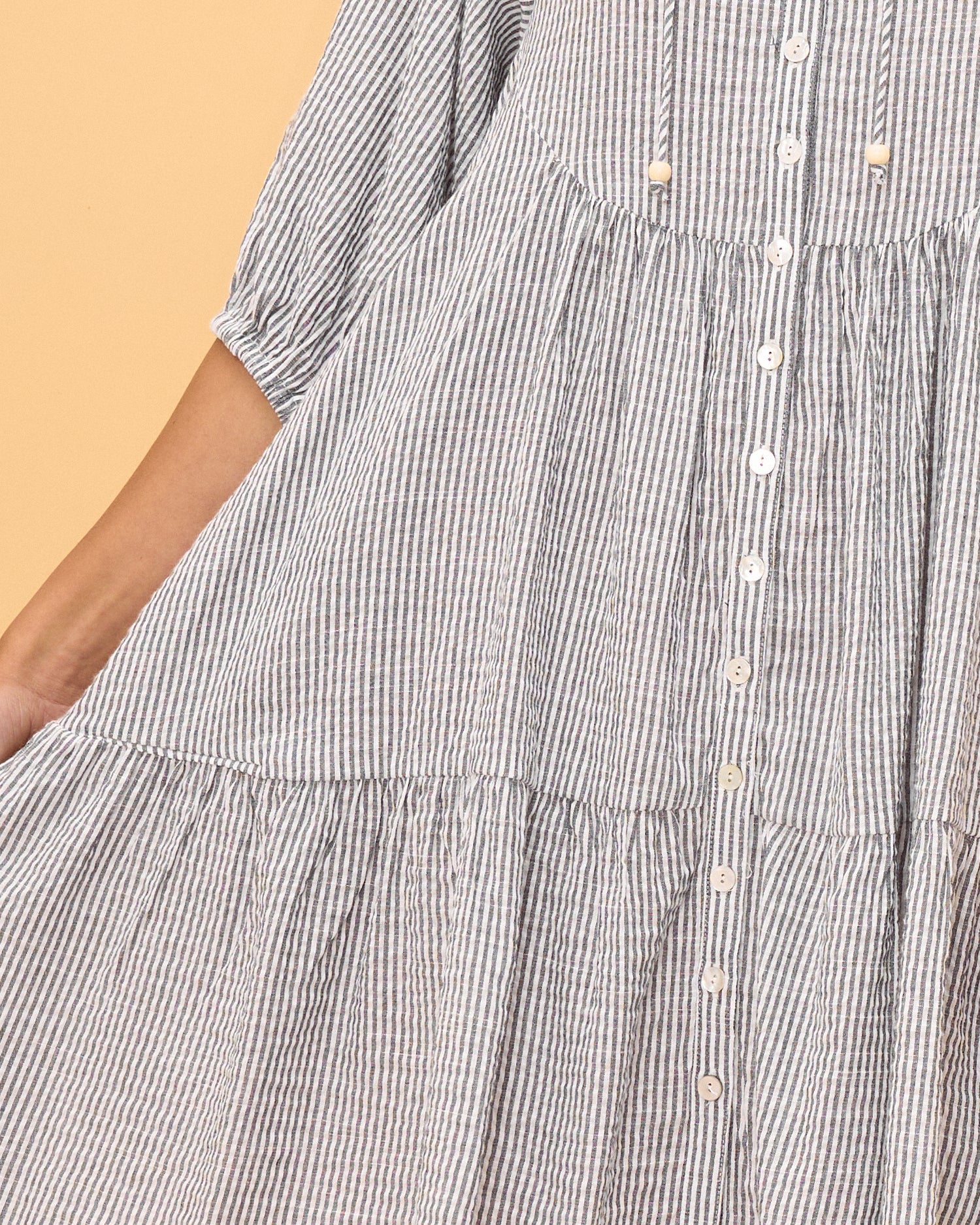 Our Raleigh dress is super breezy and comfortable, definitely the perfect dress for you! The lightweight fabric is perfect for hot summer days, and the trendy grey stripe print will have you looking stylish for any event. The V-neckline and button-down front add a touch of elegance, while the balloon sleeves and mini length keep it casual and fun. There are 2 hidden side pockets so you can keep your items close without compromising style. Don't miss out on this must-have summer dress!