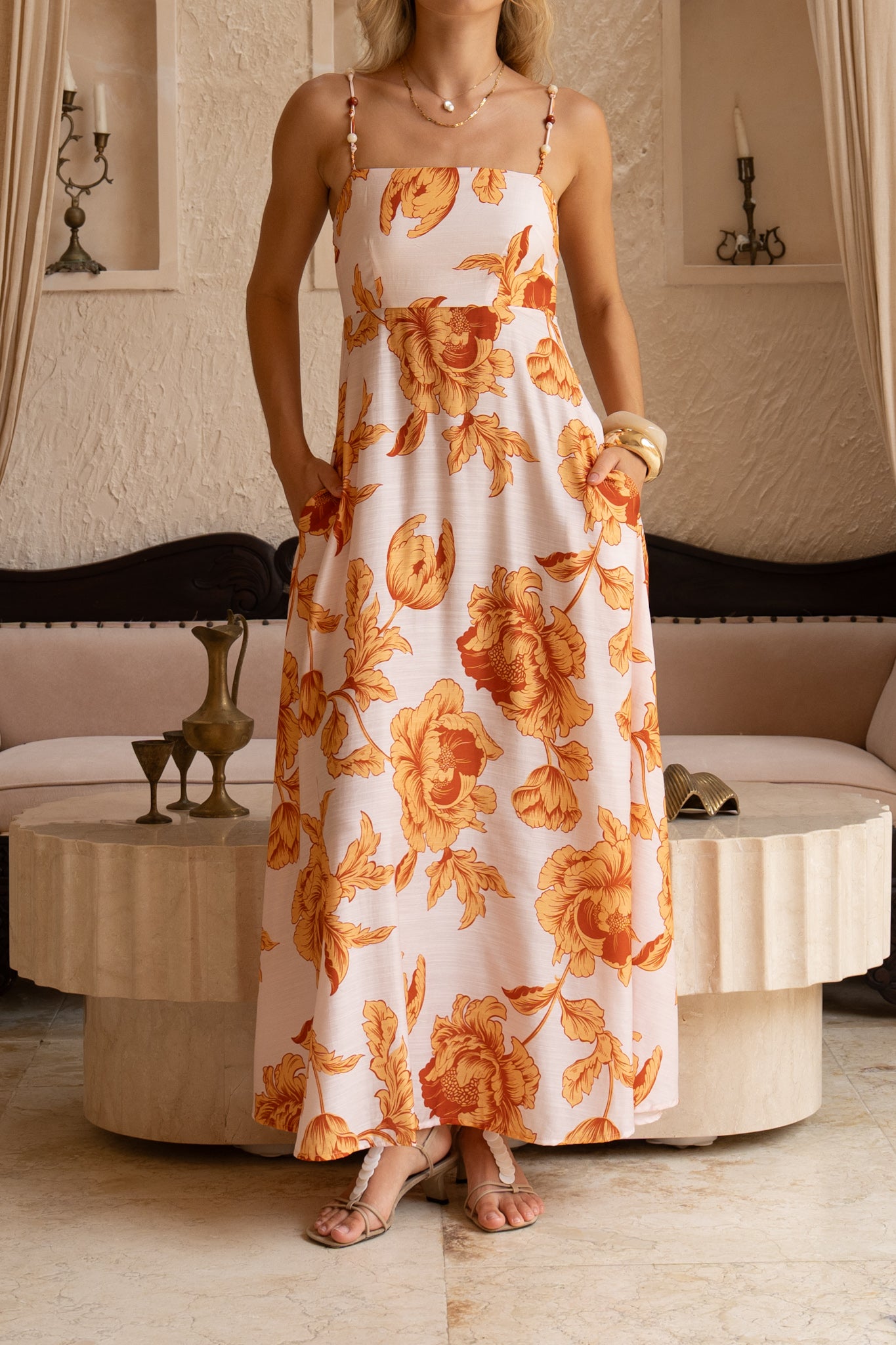 - Slim straps embellished with delicate bead detailing