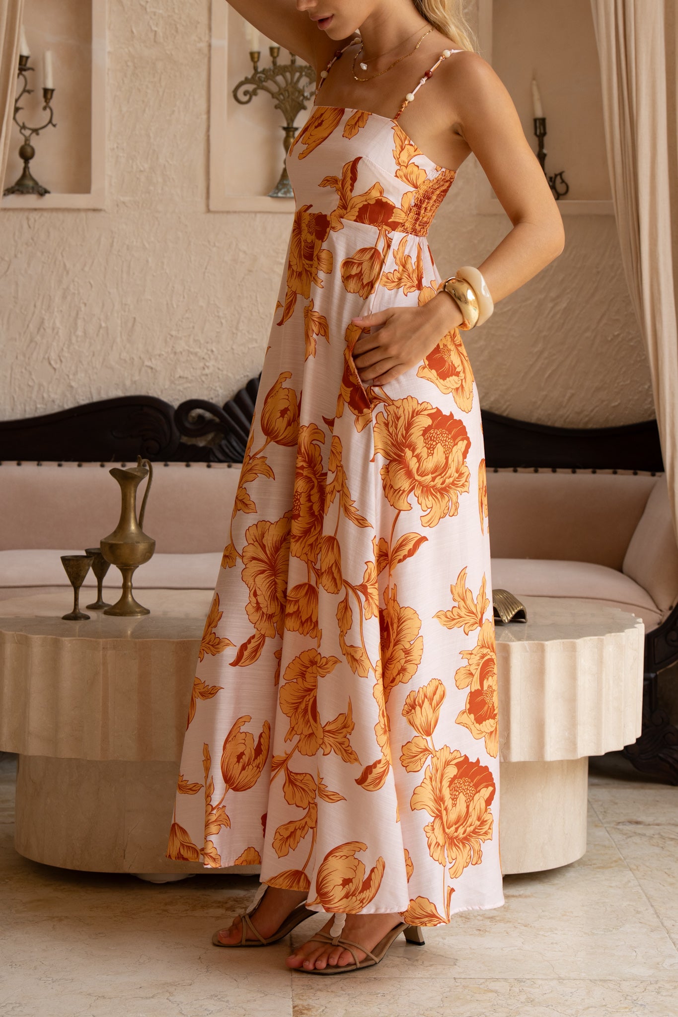 Reya Orange Floral Beaded Flared Maxi Dress