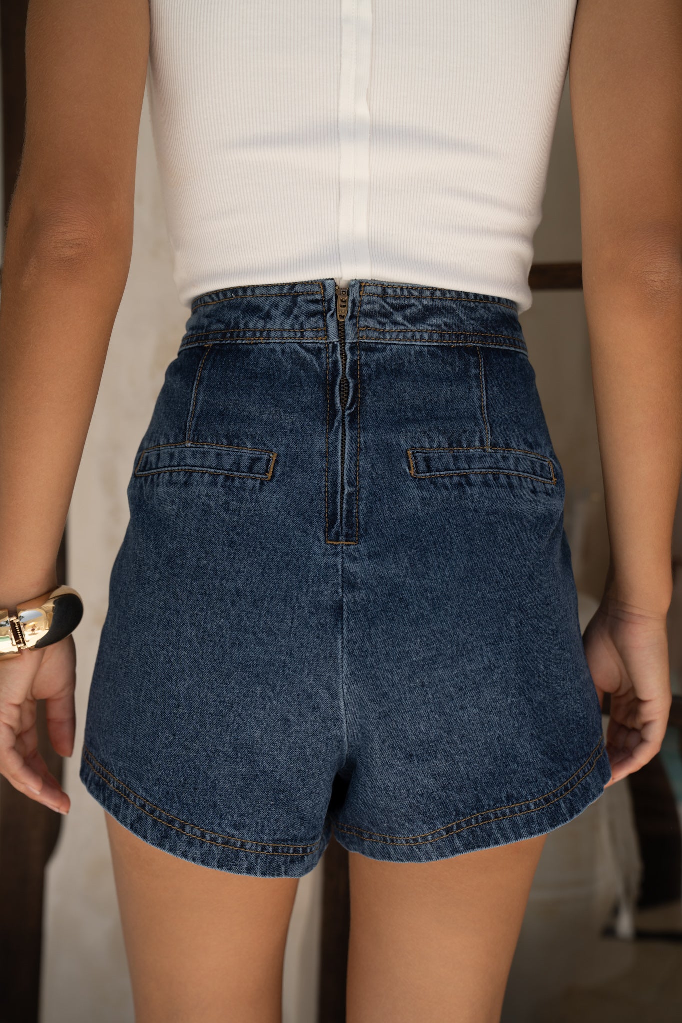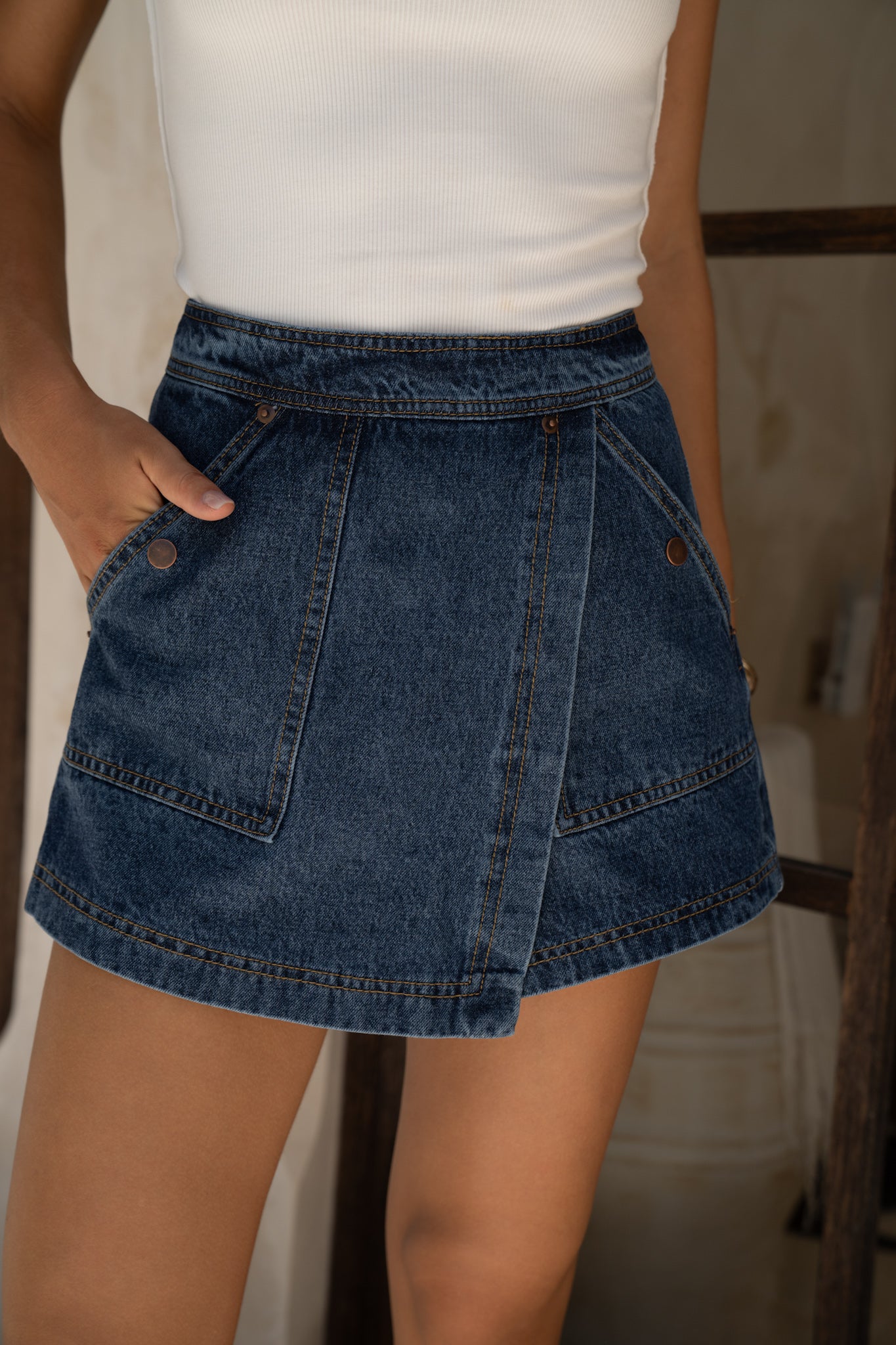 Cut from structured 100% cotton denim, this Risa Blue Denim Asymmetric Skort gives you the look of a mini skirt with the secret security of shorts underneath — so you can hop on bikes, run for trains, sit on picnic rugs… without doing the awkward hem-check every five seconds. The high waist cinches you in just right, while the wrap-front panel creates that angled, asymmetric line that instantly lengthens your legs. It’s a tiny detail, but honestly, it does the most.