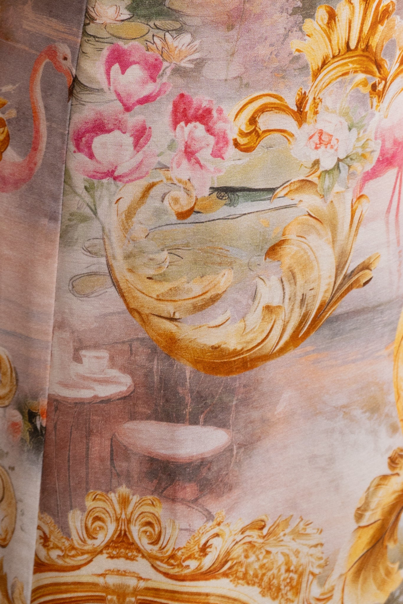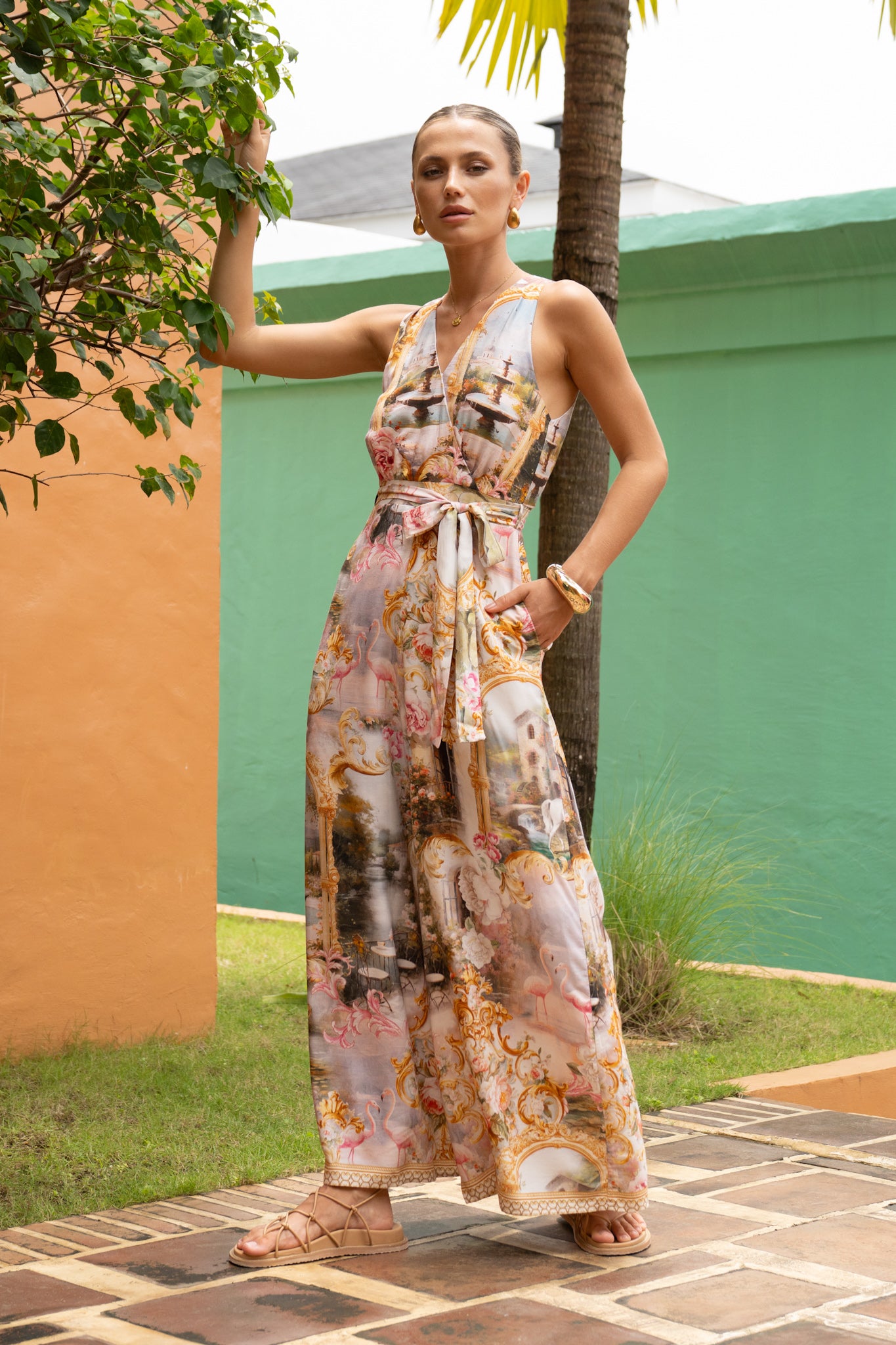 Roselune looks like a painting you’d find in an old European villa — ornate arches, soft landscapes, romantic florals, a little drama, a little fantasy. It’s rich, layered, and beautifully detailed, turning the entire jumpsuit into a wearable artwork. You don’t “add interest” with accessories here… you are the interest.