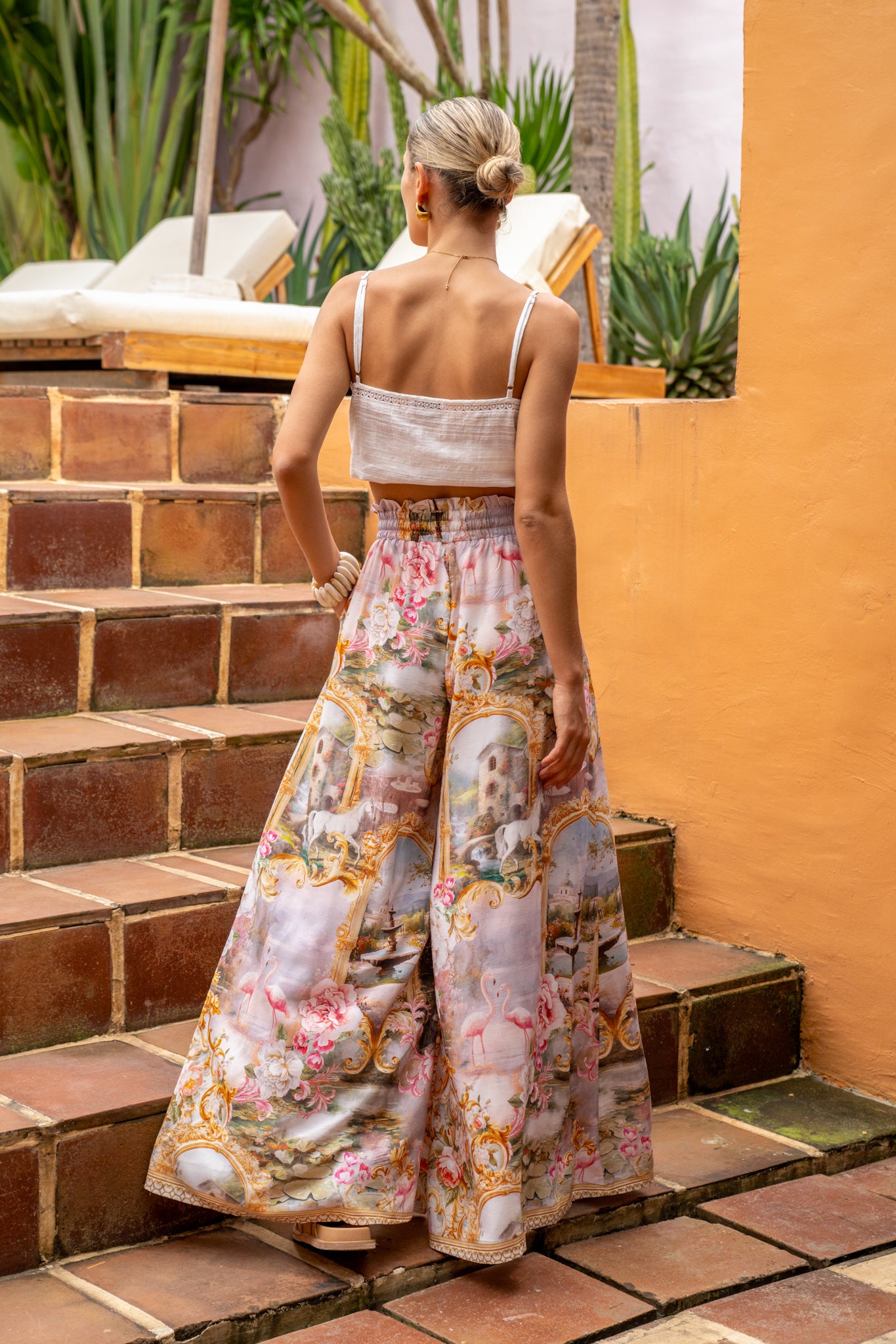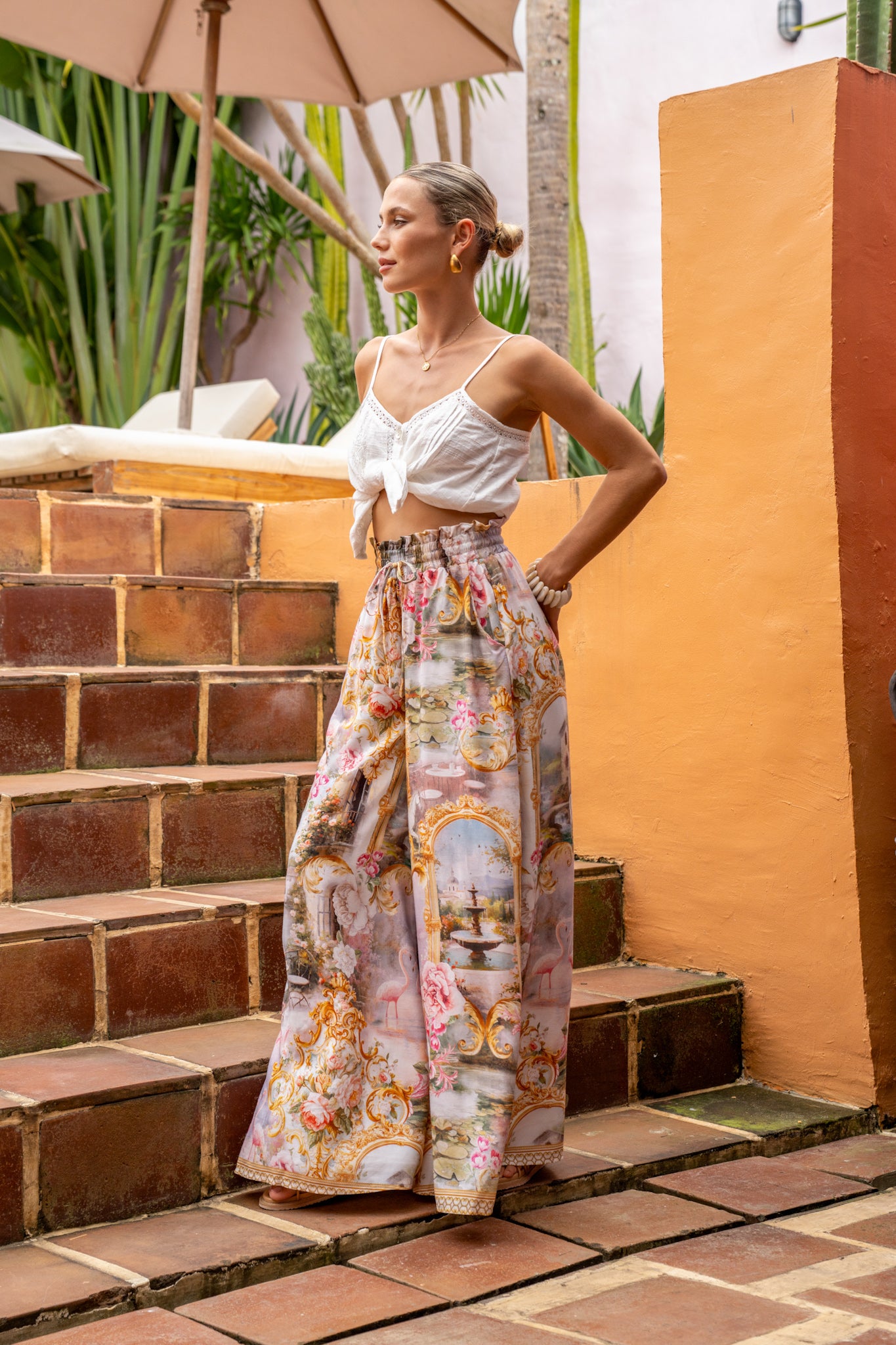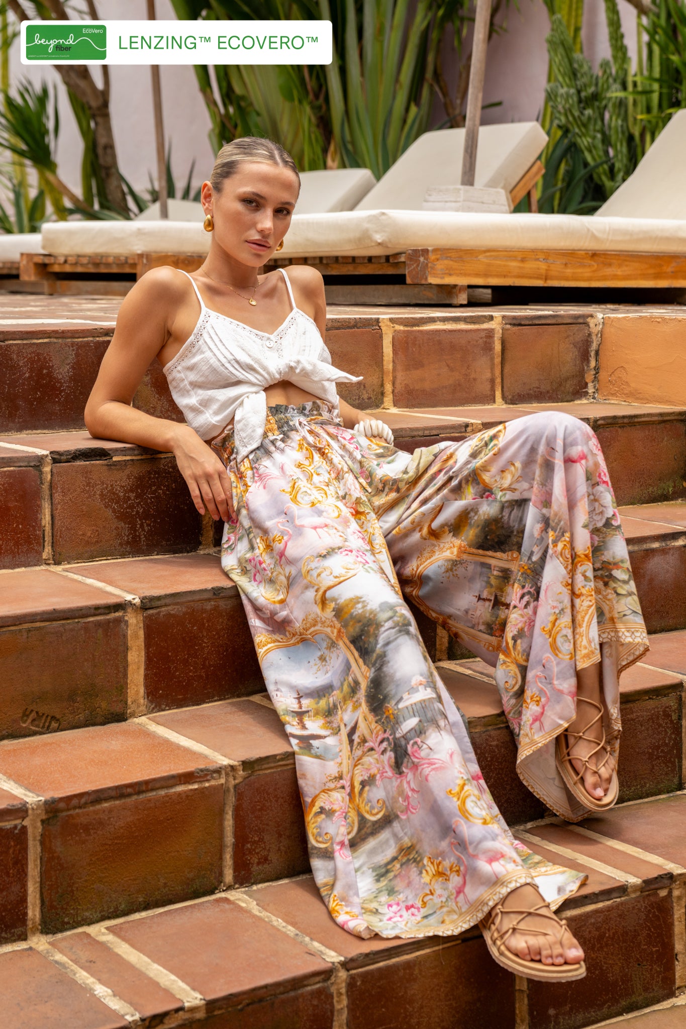These aren’t just wide leg pants, they’re walking murals. Soft arches, painterly florals, dreamy fountains, old-world garden scenes… it’s giving “European summer postcard” energy, but in the most wearable, non-costume way. Romantic, yes. Over the top? Surprisingly not. It just works.