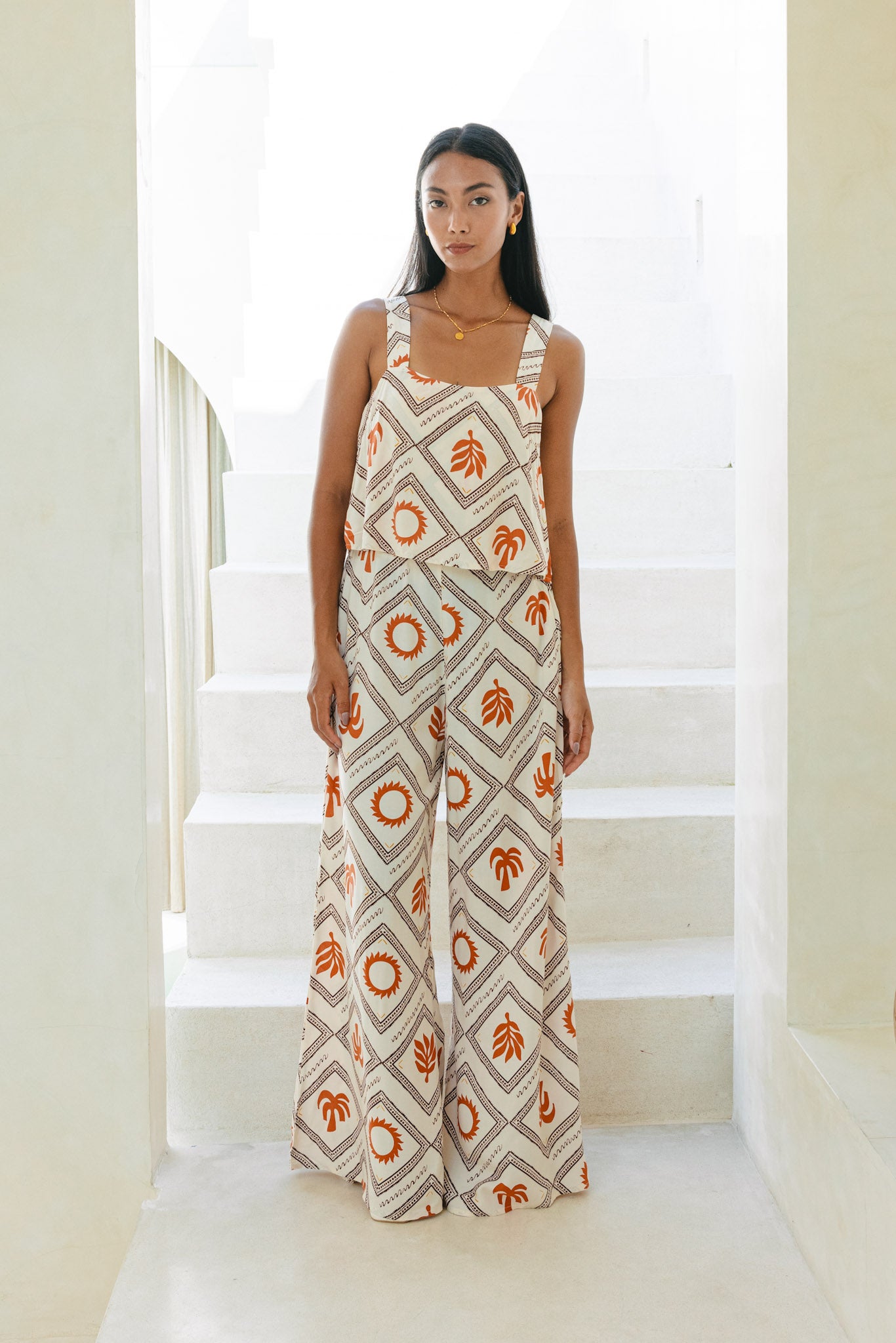 Indulge in the laid-back elegance of our Savita Beige Rust Tropical Jumpsuit – a must-have addition to your summer wardrobe. With a square neckline, thick shoulder straps, and a flowy front panel, it effortlessly combines comfort and style. The hidden zipper at the back and stretchy shirred waist panel ensure a flattering fit. Embrace the maxi length and wide leg in white adorned with a beige, brown, and rust tropical abstract geo tile print. Elevate your summer wardrobe with this laid-back yet elegant jumpsuit, perfect for any occasion.