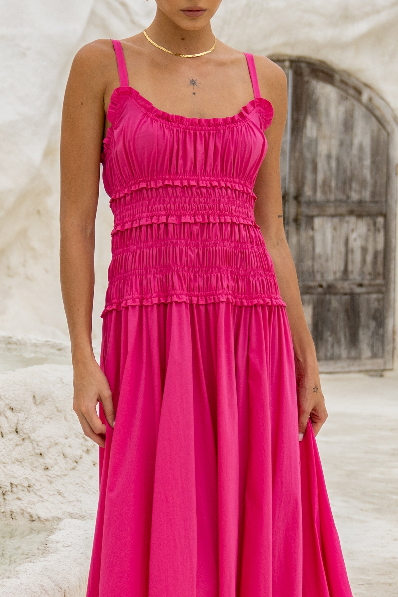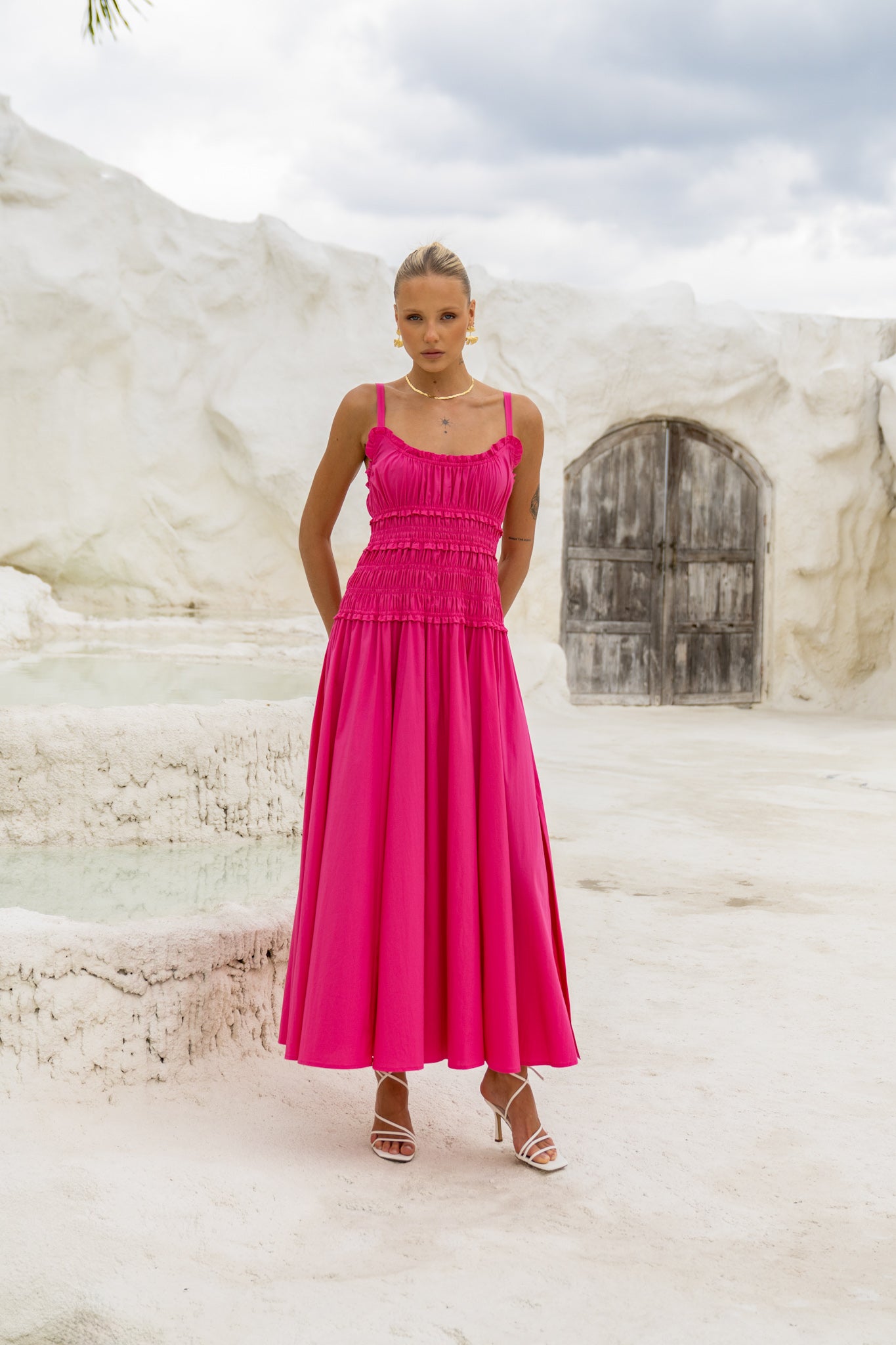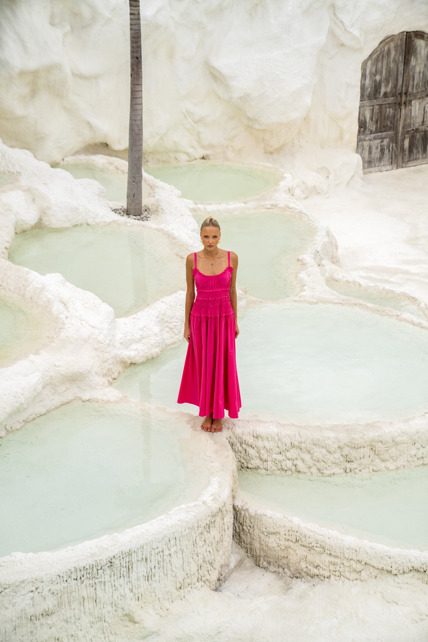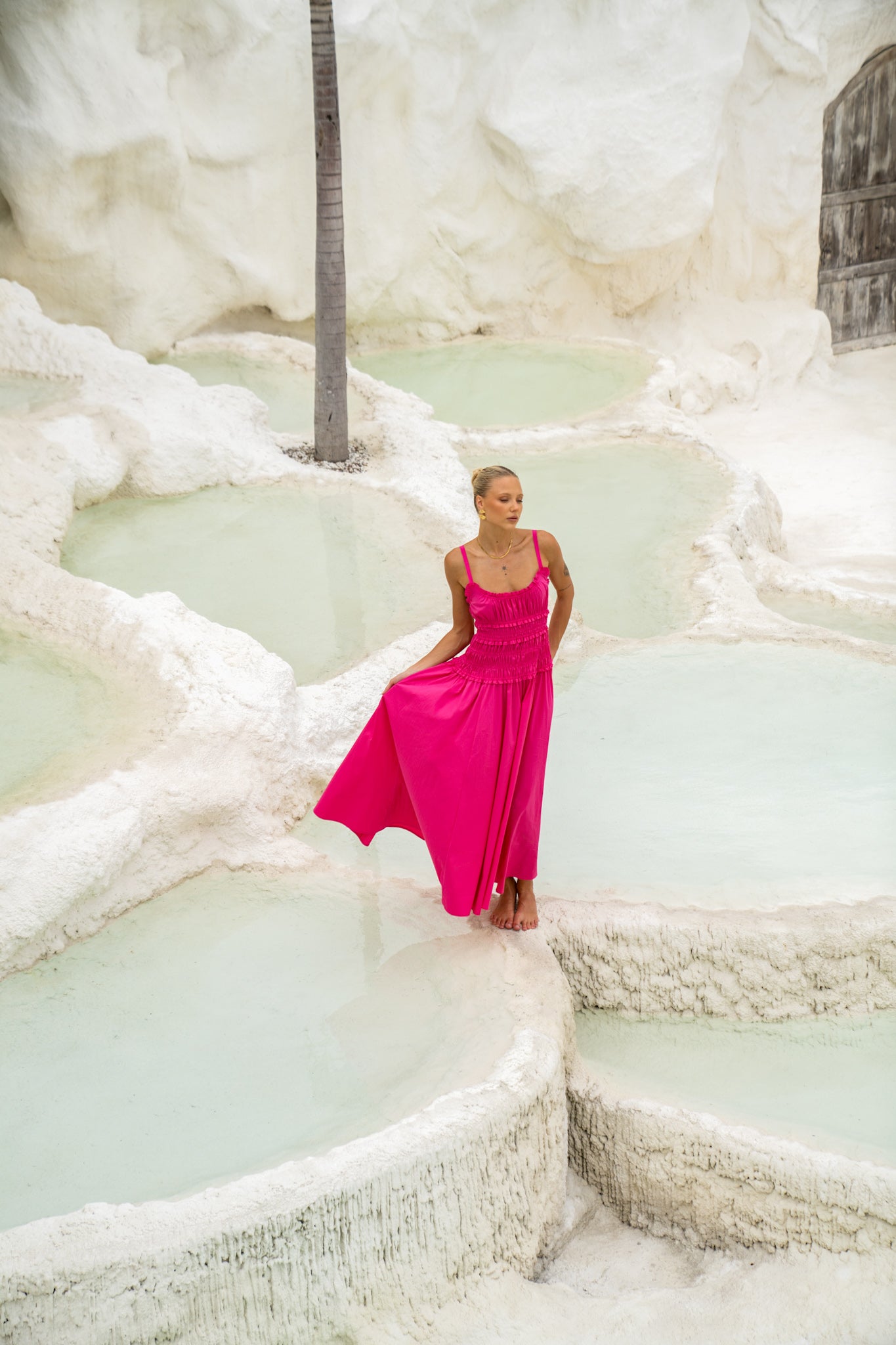 If summer were a dress, she’d look exactly like this. The Seline Hot Pink Maxi Dress is that flirty, feel-good piece you didn’t know you needed, until you tried it on and instantly felt like twirling. And not just a little twirl. Like... full-spin, wind-in-your-hair, "main character in a romantic drama" kind of moment.