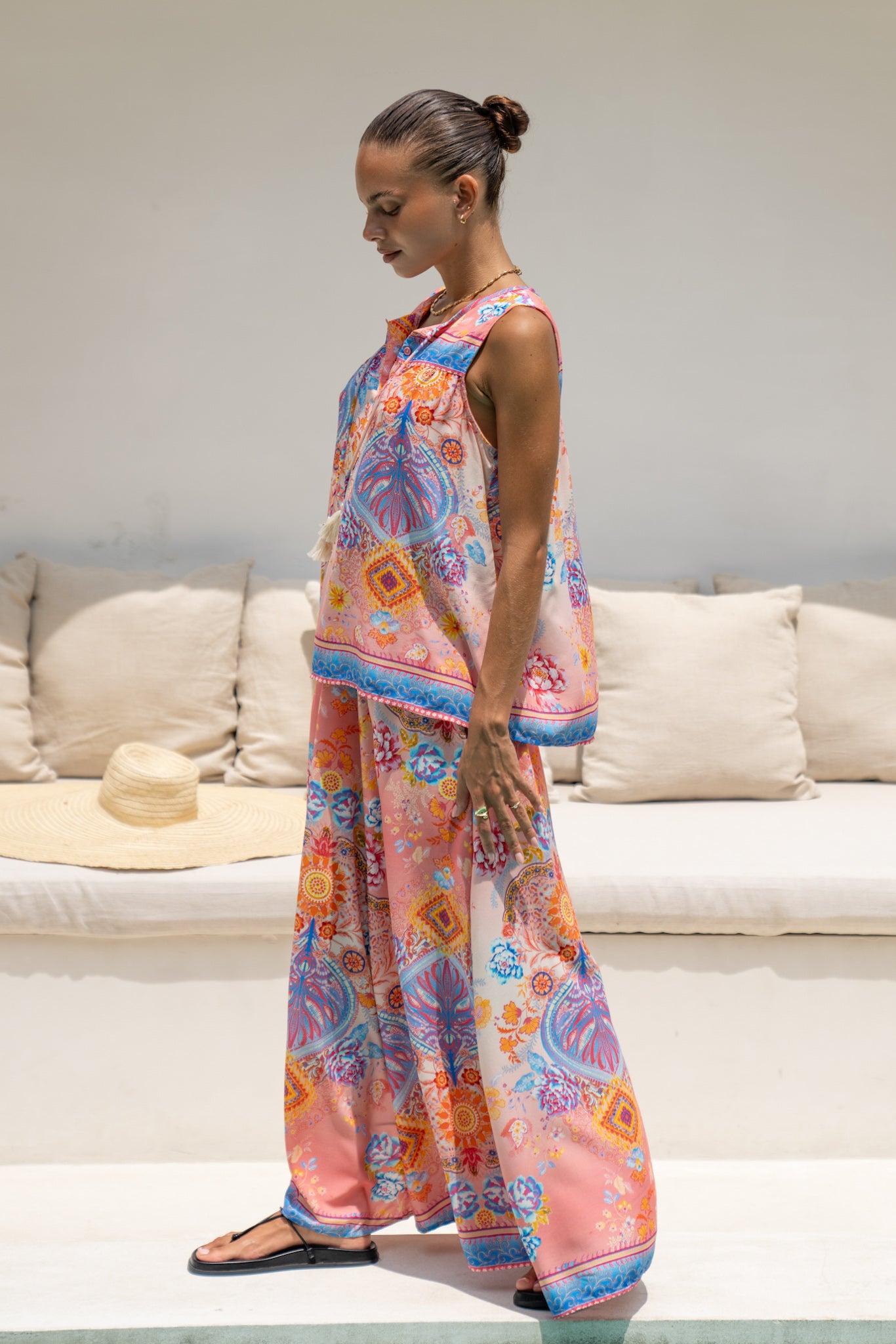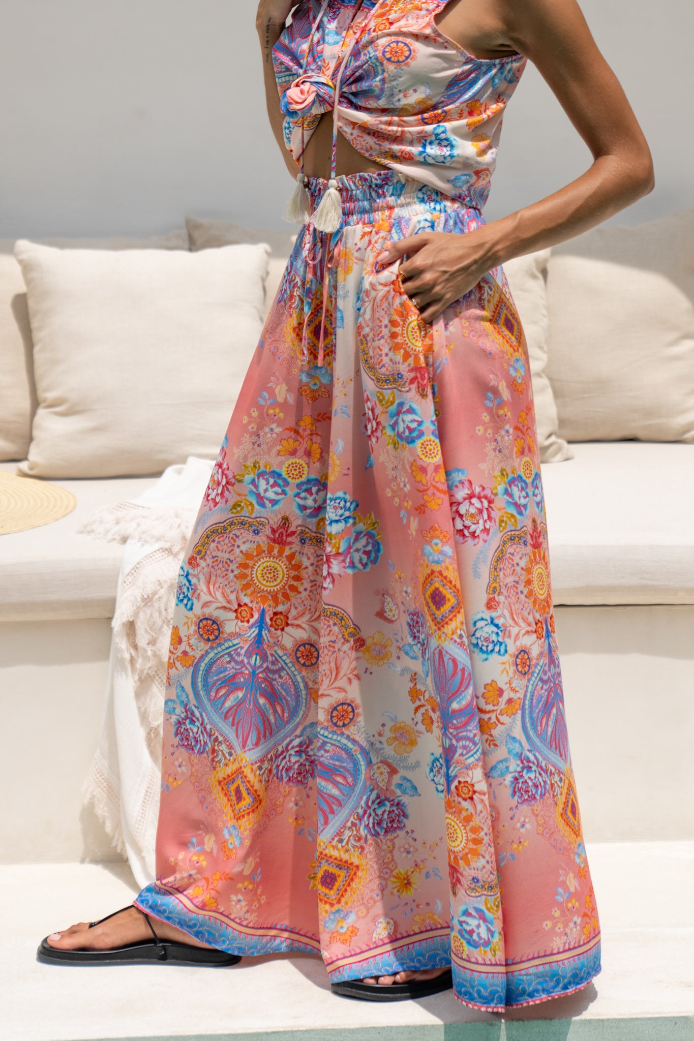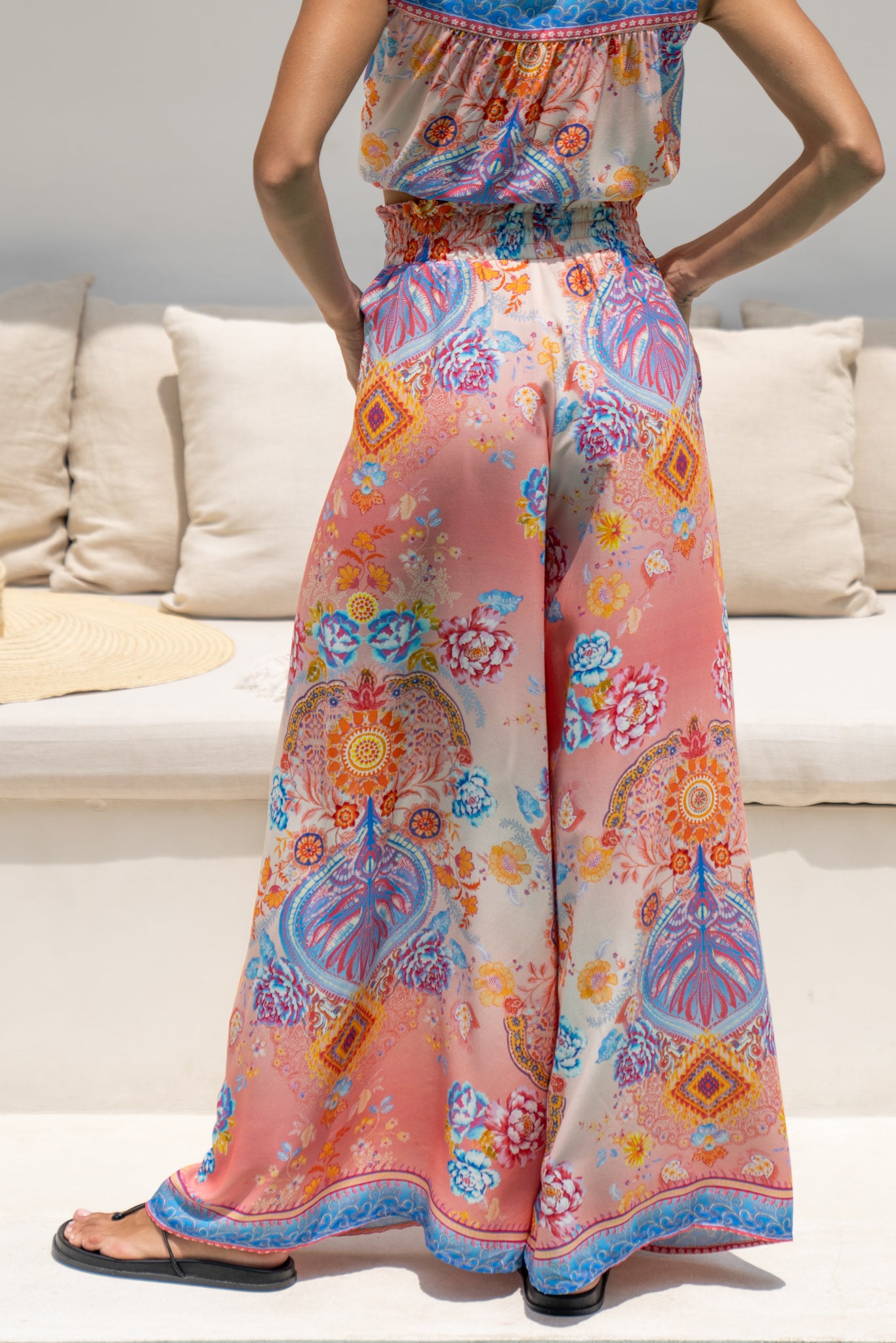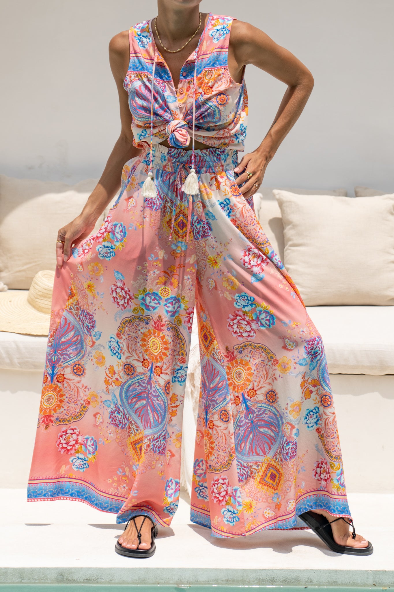 Elevate your wardrobe with the Serafina Pink Blue Boho Wide Leg Pants. These gorgeous pants feature a bold and beautiful print in an elegant wide-leg fit. With the elastic self-tie waist, you can customise the fit to your body shape for the ultimate comfort and confidence. These beautiful pants also have side pockets, so you can keep your essentials close without compromising style. Constructed in breathable fabric, these pants ensure you stay cool throughout summer days or nights. Whether you're going for a relaxed weekend look or something more casual-chic, these cute abstract pants are perfect for any occasion!