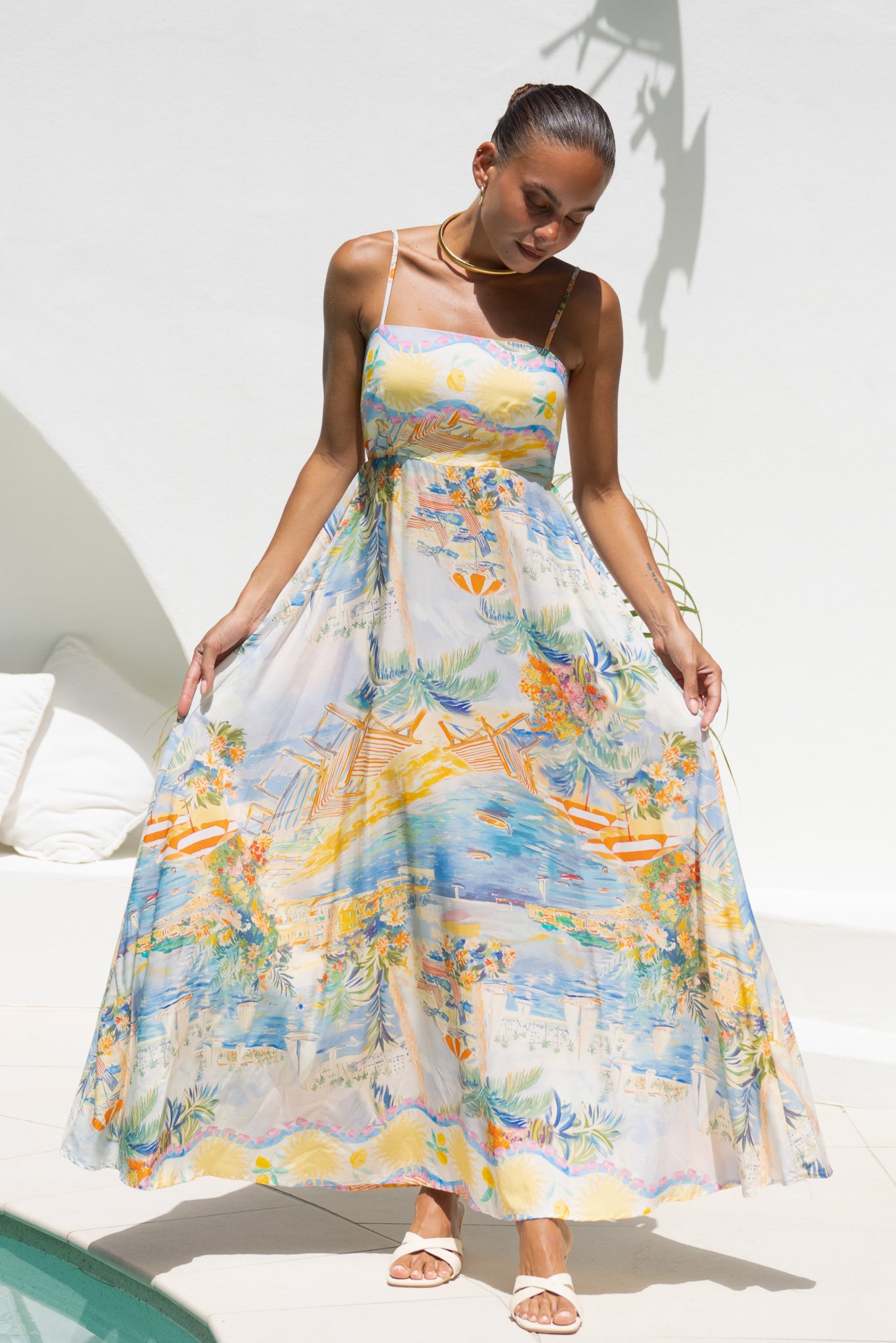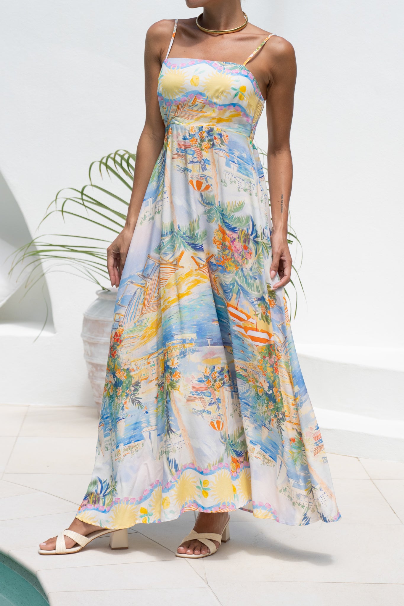 Meet the Solmar Multicolour Abstract Flared Maxi Dress – a perfect mix of elegance and playful charm. It features a straight neckline, adjustable shoulder straps, and a shirred stretchy back bodice to ensure comfort and flexibility. The practical hidden side pockets let you keep your essentials close to you while on the go. The gorgeous empire waistline with flared skirt falls to a mid-maxi length, suitable for many occasions. The multicolour abstract print adds a unique and cute flair, making it a standout in any wardrobe. Ideal for both casual outings and special occasions, the Solmar dress blends comfort and chic effortlessly.