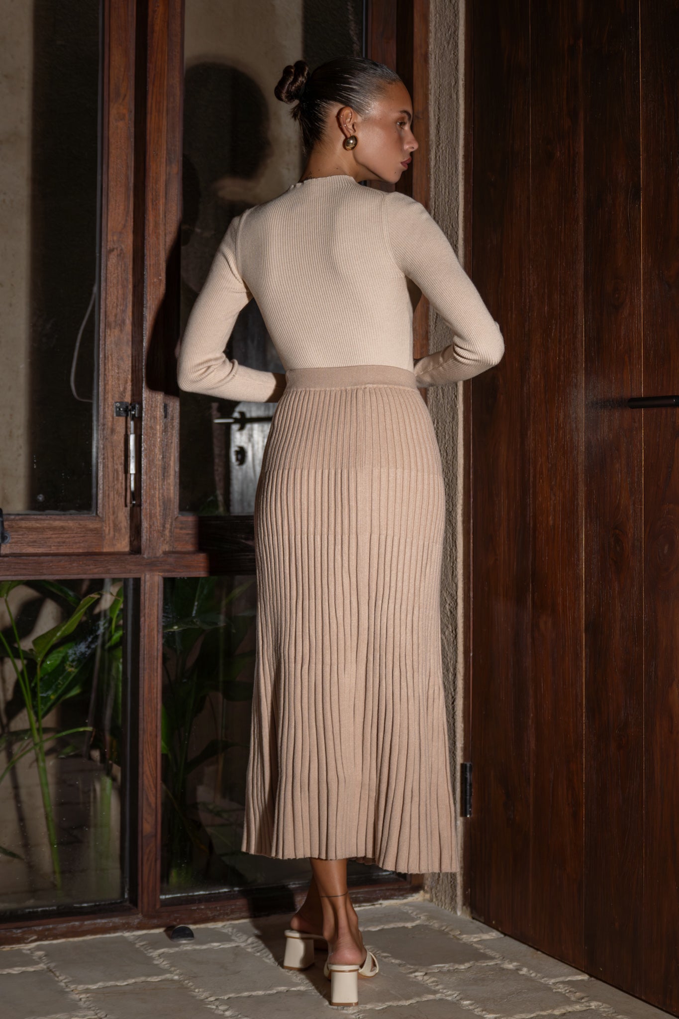 Stasia Camel Beige Pleated Knit Maxi Skirt