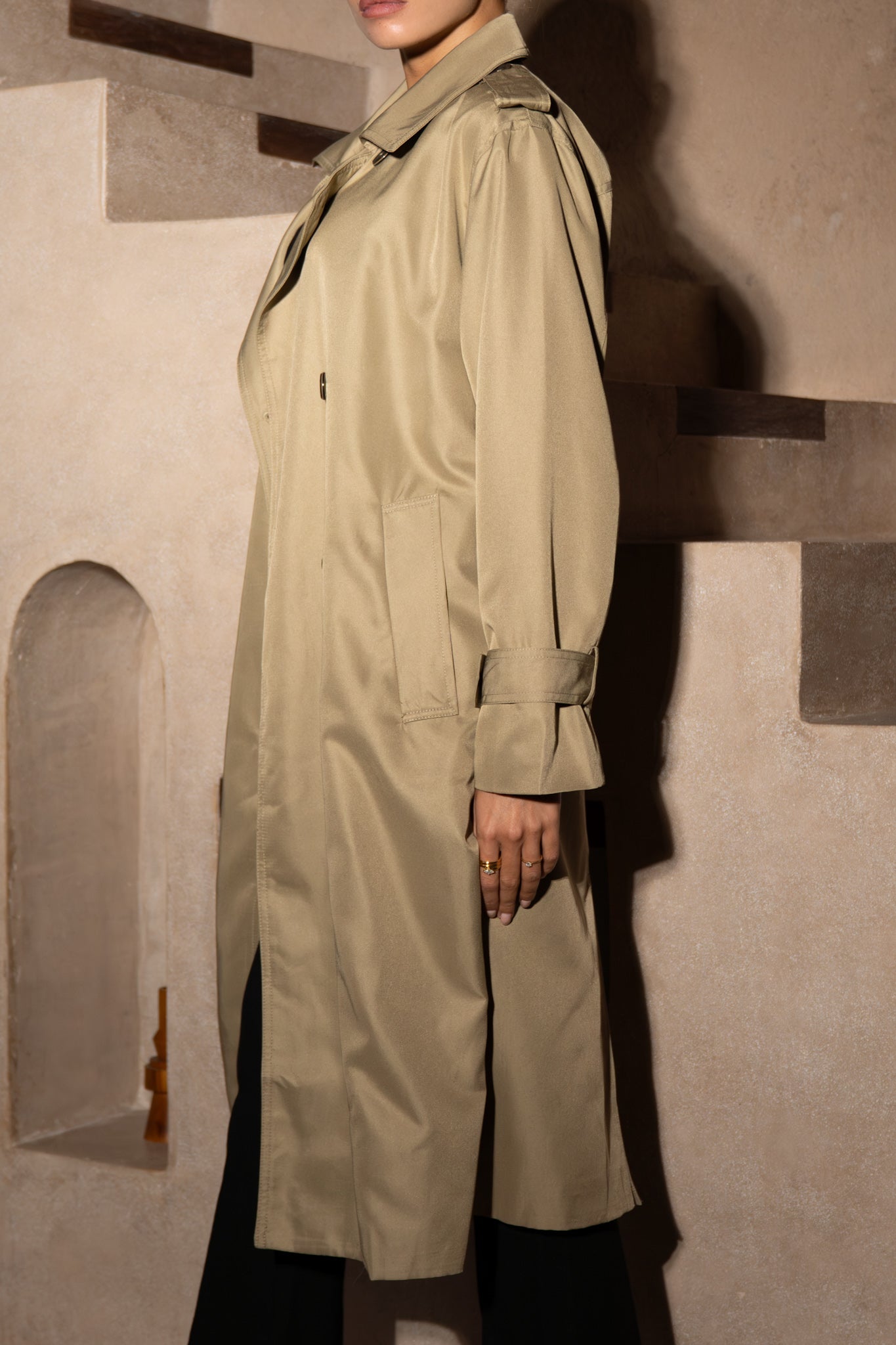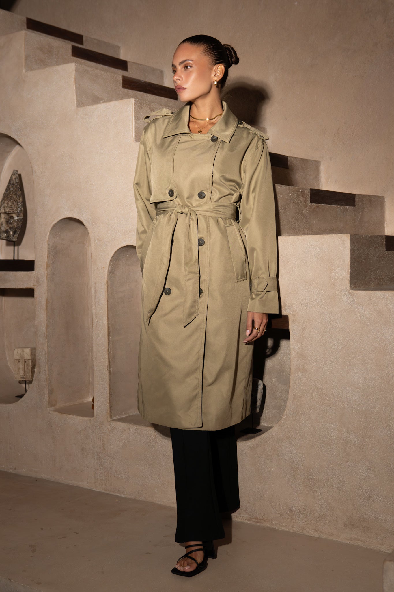 A trench coat with main character energy. The Trace silhouette doesn't just walk into a room. It commands it. Sculpted with a nipped-in waist (thank you, adjustable tie) and those classic, sweeping lapels that give it just the right amount of drama, this is the coat that will get compliments at coffee shops, in boardrooms, even on your daily dog walk. Double-breasted buttons cinch the front with vintage poise, while the epaulettes and storm flap nod to timeless menswear tailoring because power dressing is a mood, not a moment. It layers beautifully, moves with intent, and somehow makes everything underneath look more put together. Heels, sneakers, boots. Your coat’s the one doing the talking. For days when the air is crisp and your mood is elevated, Trace is your wearable confidence boost.