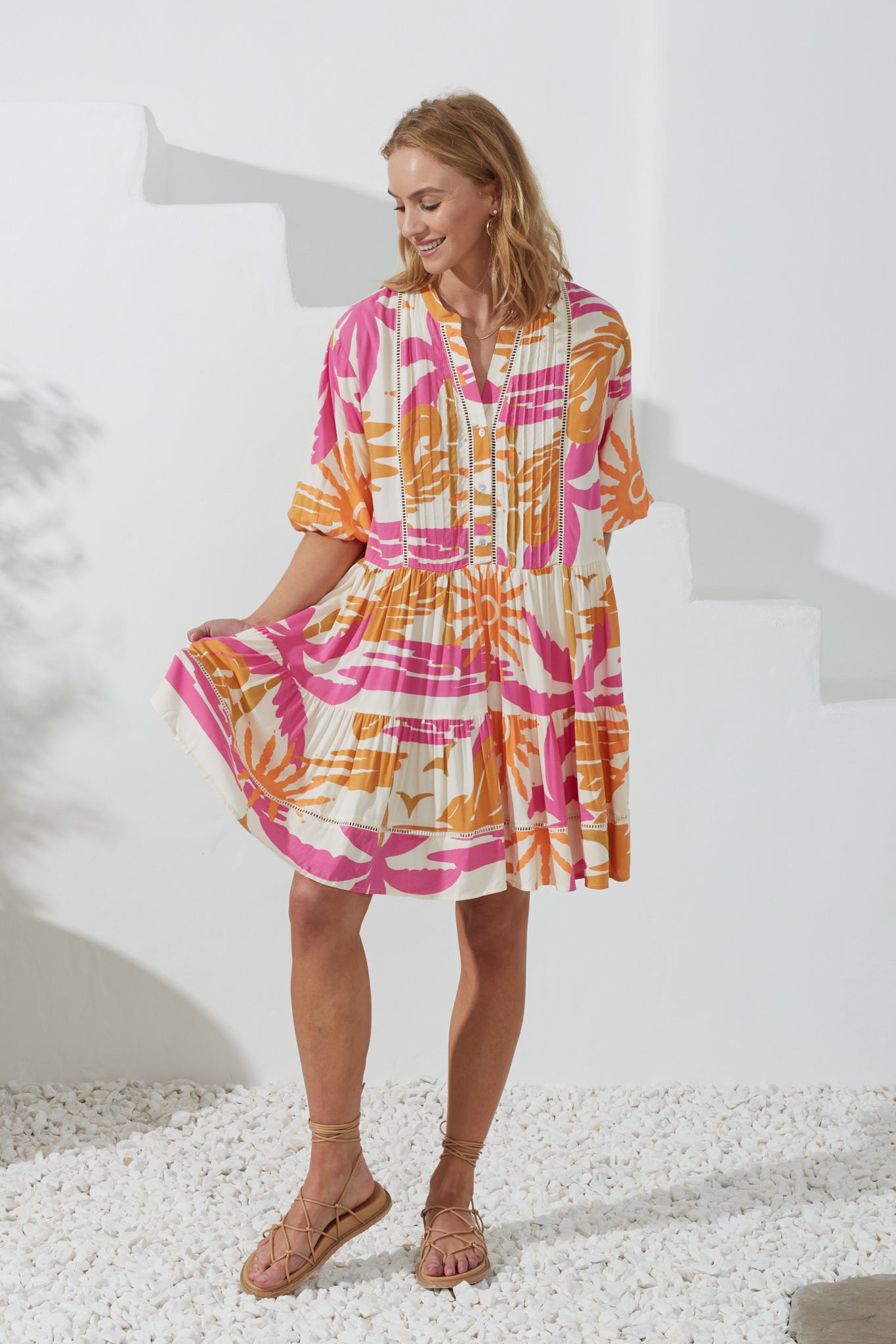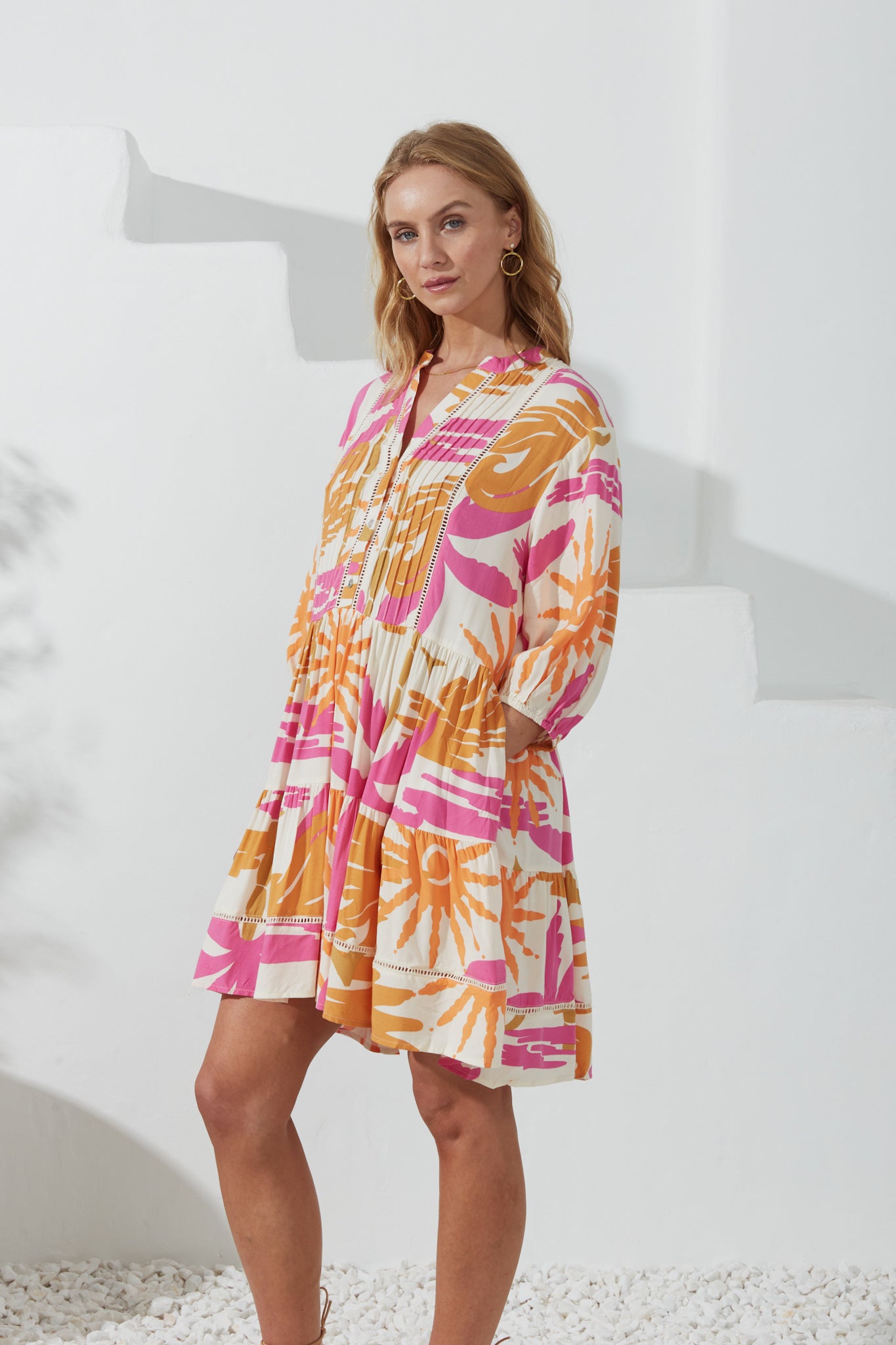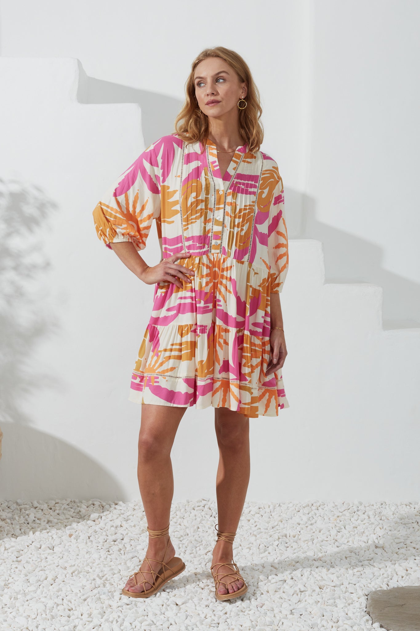 Introducing the Tropicana Pink Orange Abstract Lace Detail Mini Dress, a vibrant and stylish addition to your wardrobe. This dress features a chic stand collar and a flattering V-neckline, complemented by a button-down front bodice. The pin tuck pleats and delicate lace detailing add an elegant touch, while the 3/4 length balloon sleeves with elasticated cuffs provide a comfortable fit. With two convenient side pockets and a tiered skirt design, this mini-length dress offers both style and functionality. Adorned with an eye-catching orange, pink, and beige tropical abstract beach-themed print, the Tropicana Mini Dress is perfect for sunny days and tropical getaways.