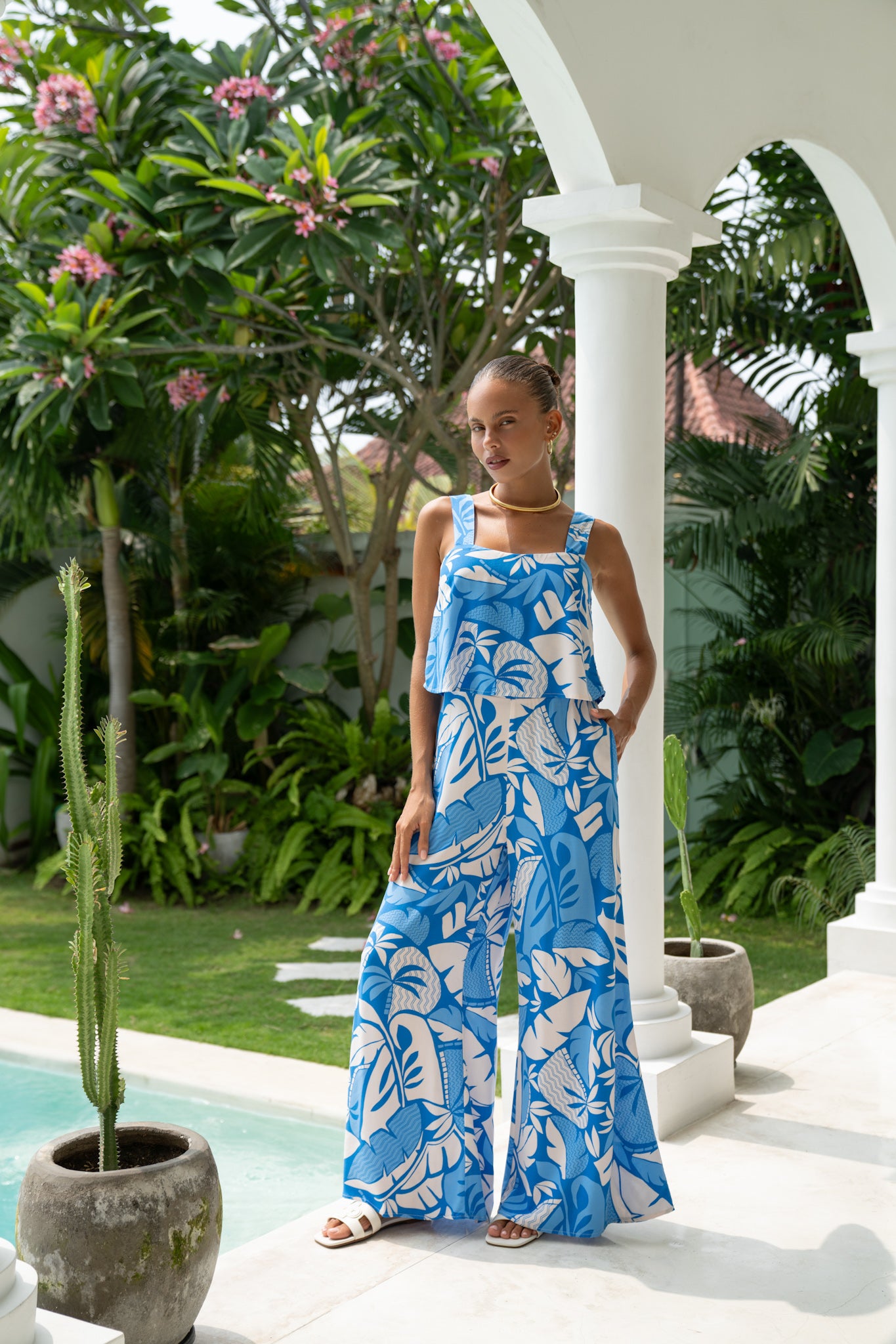 Indulge in the laid-back elegance of our Vale Blue Tropical Jumpsuit – a must-have addition to your summer wardrobe. With a square neckline, thick shoulder straps, and a flowy front panel, it effortlessly combines comfort and style. The hidden zipper at the back and stretchy shirred waist panel ensure a flattering fit. Embrace the maxi length and wide leg adorned with blue tropical leaf print. Elevate your summer wardrobe with this laid-back yet elegant jumpsuit, perfect for any occasion.