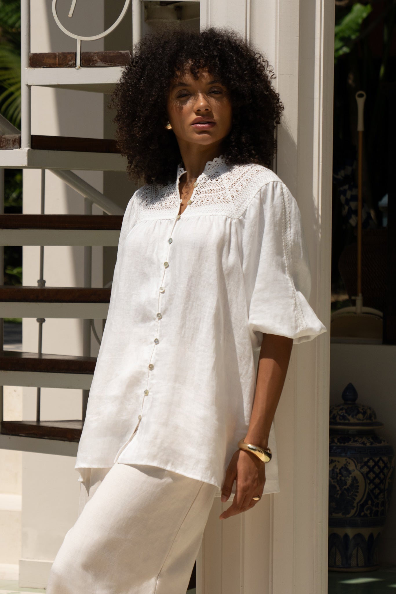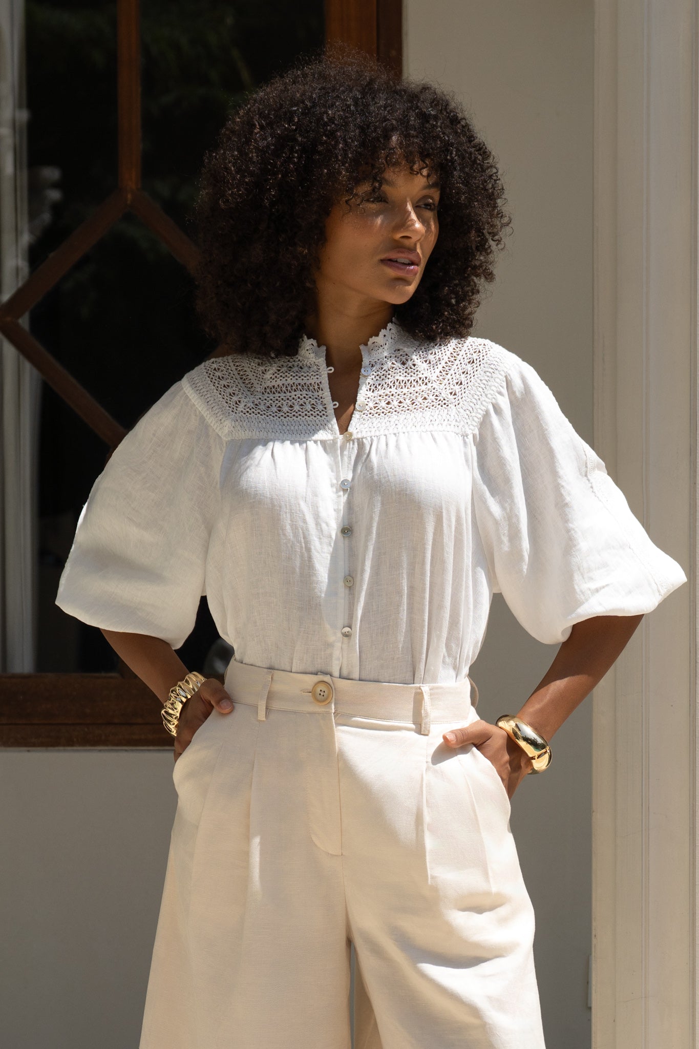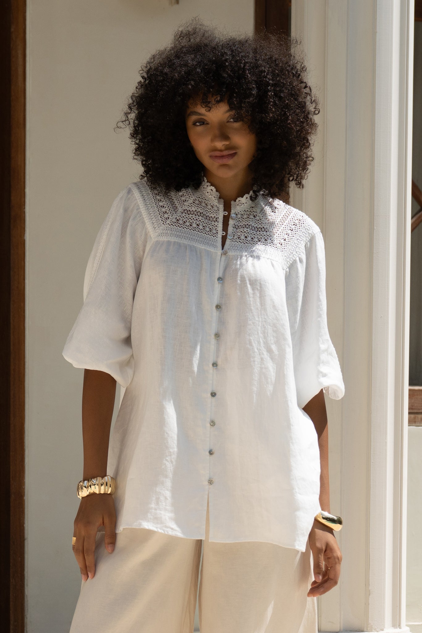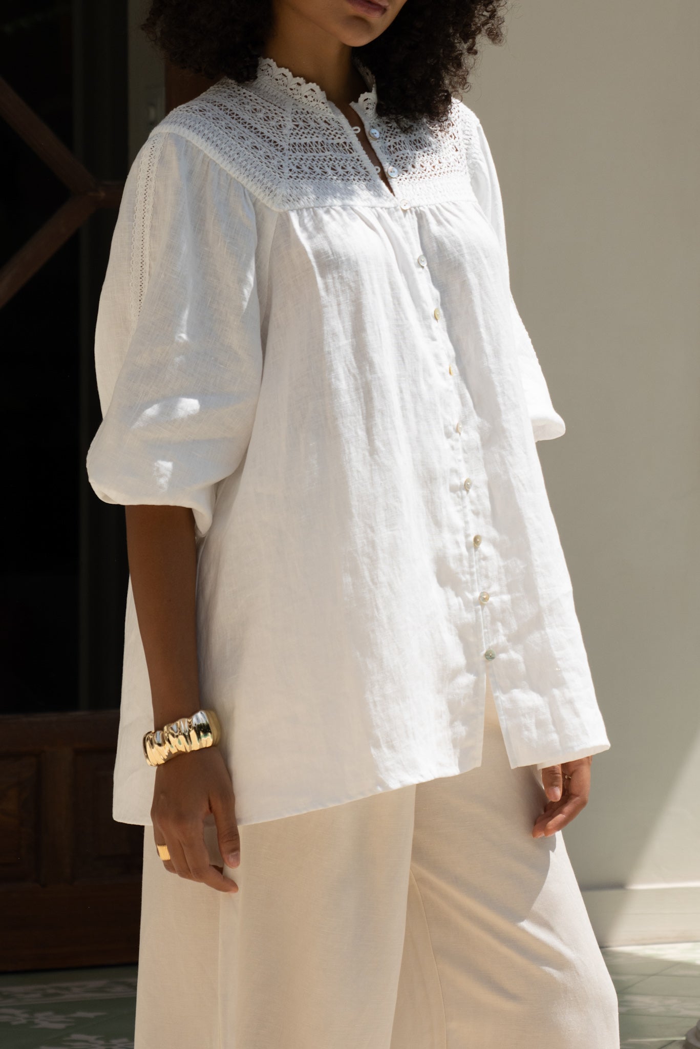 There’s something unapologetically romantic about the Winelle Blouse. Maybe it’s the ornate lace that frames the neckline like poetry. Or the soft balloon sleeves, billowing just so, adding a whisper of drama to an otherwise uncomplicated shape. It doesn’t demand attention. It draws it gently. Crafted from a featherlight linen, this blouse carries an ease that feels tailored for golden afternoons, bare ankles, and breezy daydreams. Button it all the way up for polish, or let the top few buttons fall open. Either way, it’s designed to live in your wardrobe’s most-loved section. Style it with linen trousers or your favourite lived-in denim. Maybe even barefoot in your backyard. We won’t tell.
