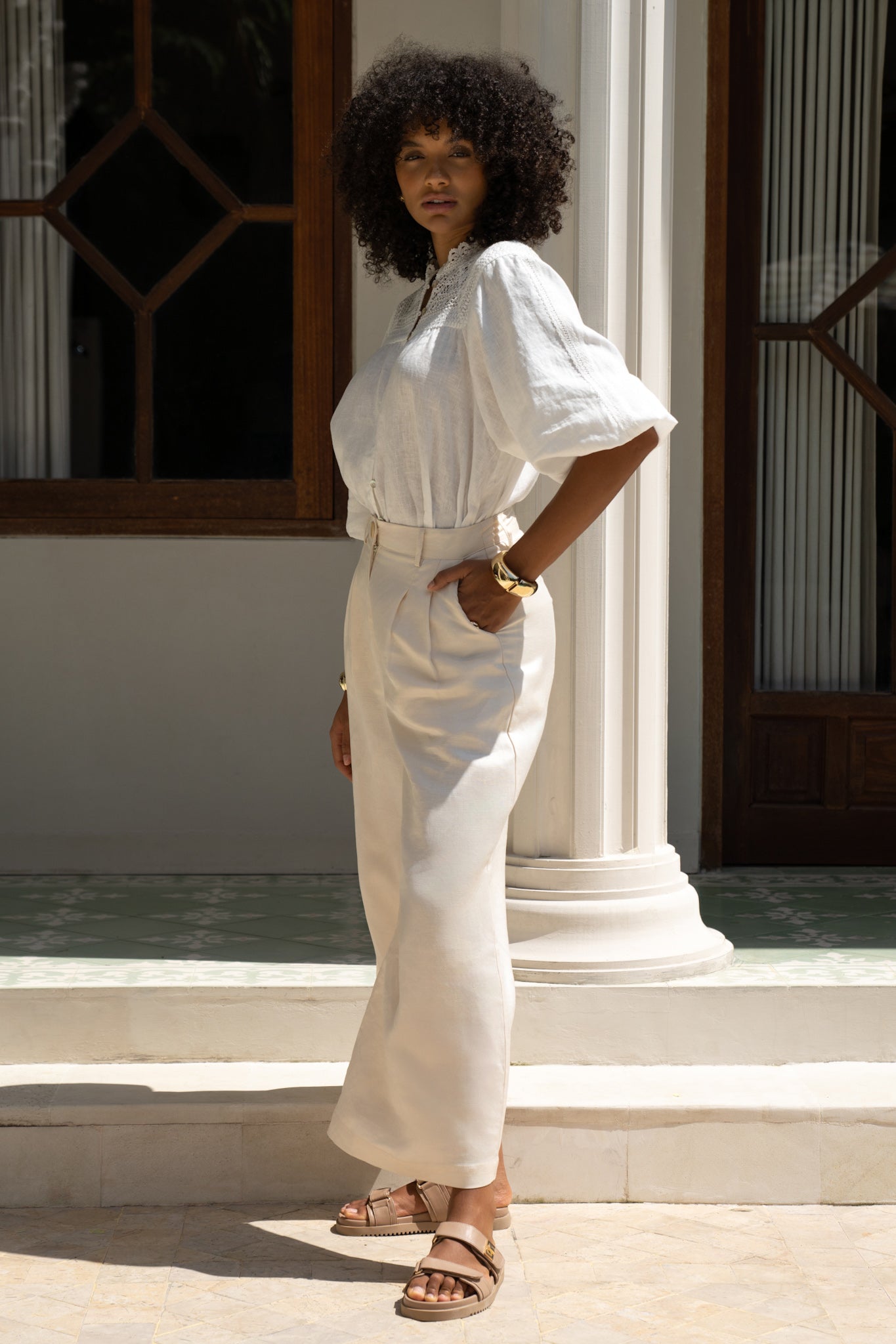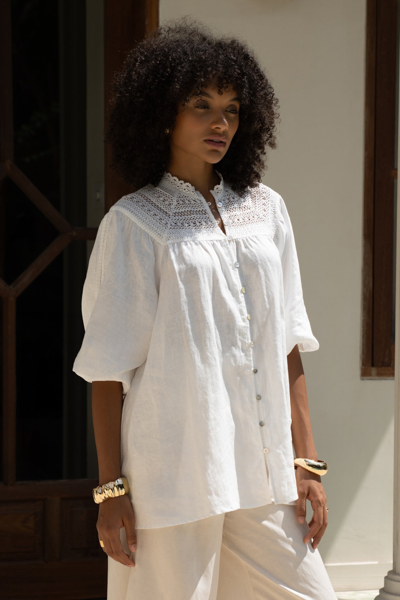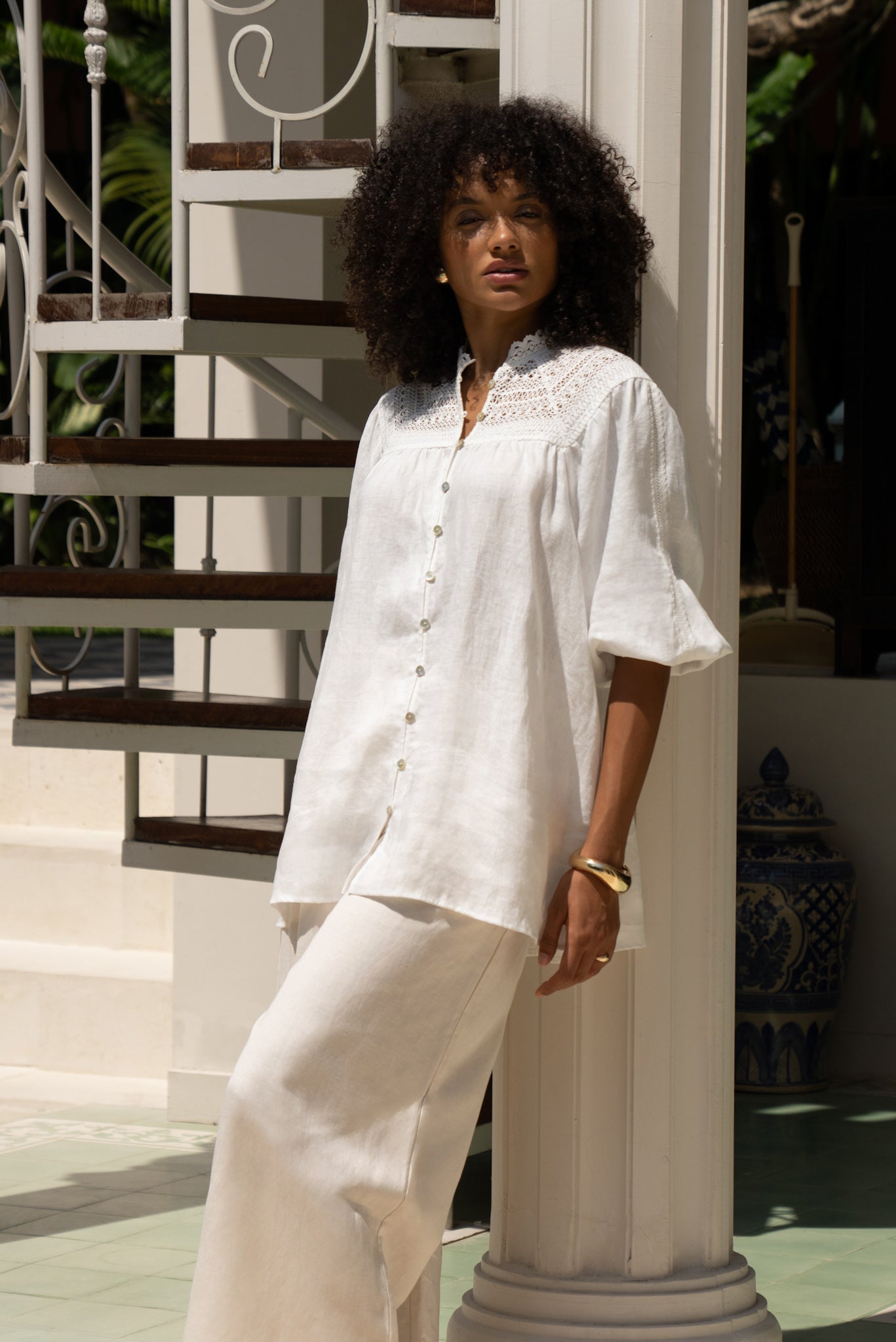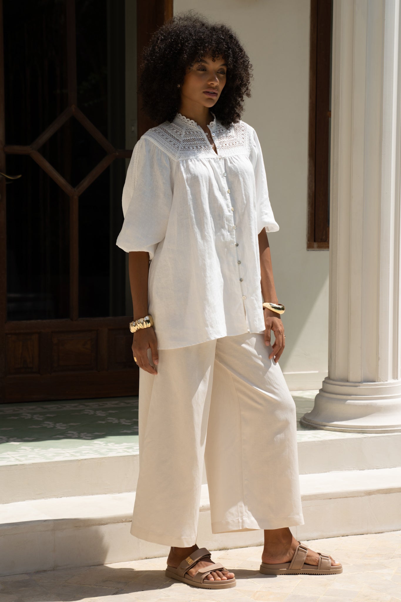 There’s something unapologetically romantic about the Winelle Blouse. Maybe it’s the ornate lace that frames the neckline like poetry. Or the soft balloon sleeves, billowing just so, adding a whisper of drama to an otherwise uncomplicated shape. It doesn’t demand attention. It draws it gently. Crafted from a featherlight linen, this blouse carries an ease that feels tailored for golden afternoons, bare ankles, and breezy daydreams. Button it all the way up for polish, or let the top few buttons fall open. Either way, it’s designed to live in your wardrobe’s most-loved section. Style it with linen trousers or your favourite lived-in denim. Maybe even barefoot in your backyard. We won’t tell.