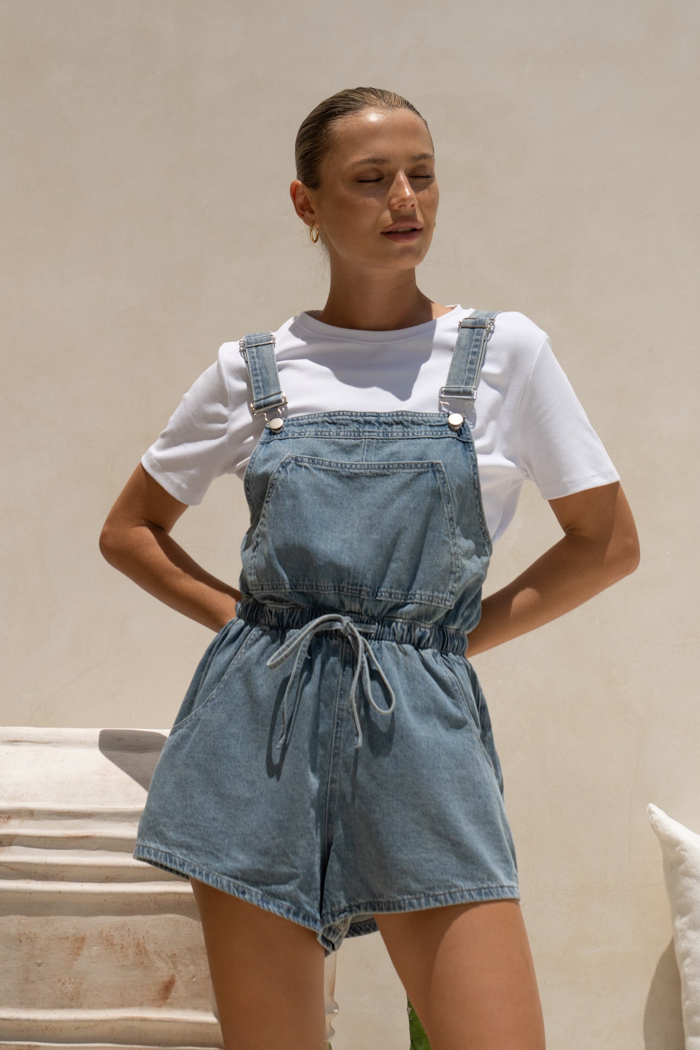 Meet Wren, your “oh-I-just-threw-this-on” denim one-and-done. She’s the cool cousin of classic dungarees - shorter, softer, a little cheeky. The light-wash denim feels broken-in from day one, while the elastic drawstring waist lets you decide the vibe: cinched and snatched or loose and laid-back. Adjustable buckle straps? Of course. A big bib pocket for lip balm, keys, snacks (no judgment) - also yes.