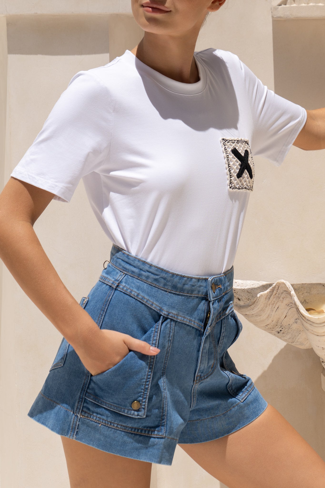 X marks the sweet spot. Xio is your crisp-white, keep-forever tee with a wink: a tactile knit patch at the chest, framed with hand-stitch-style edging, so it reads artful, not loud. Think gallery-girl meets off-duty editor. Simple from afar; delightfully textured up close.