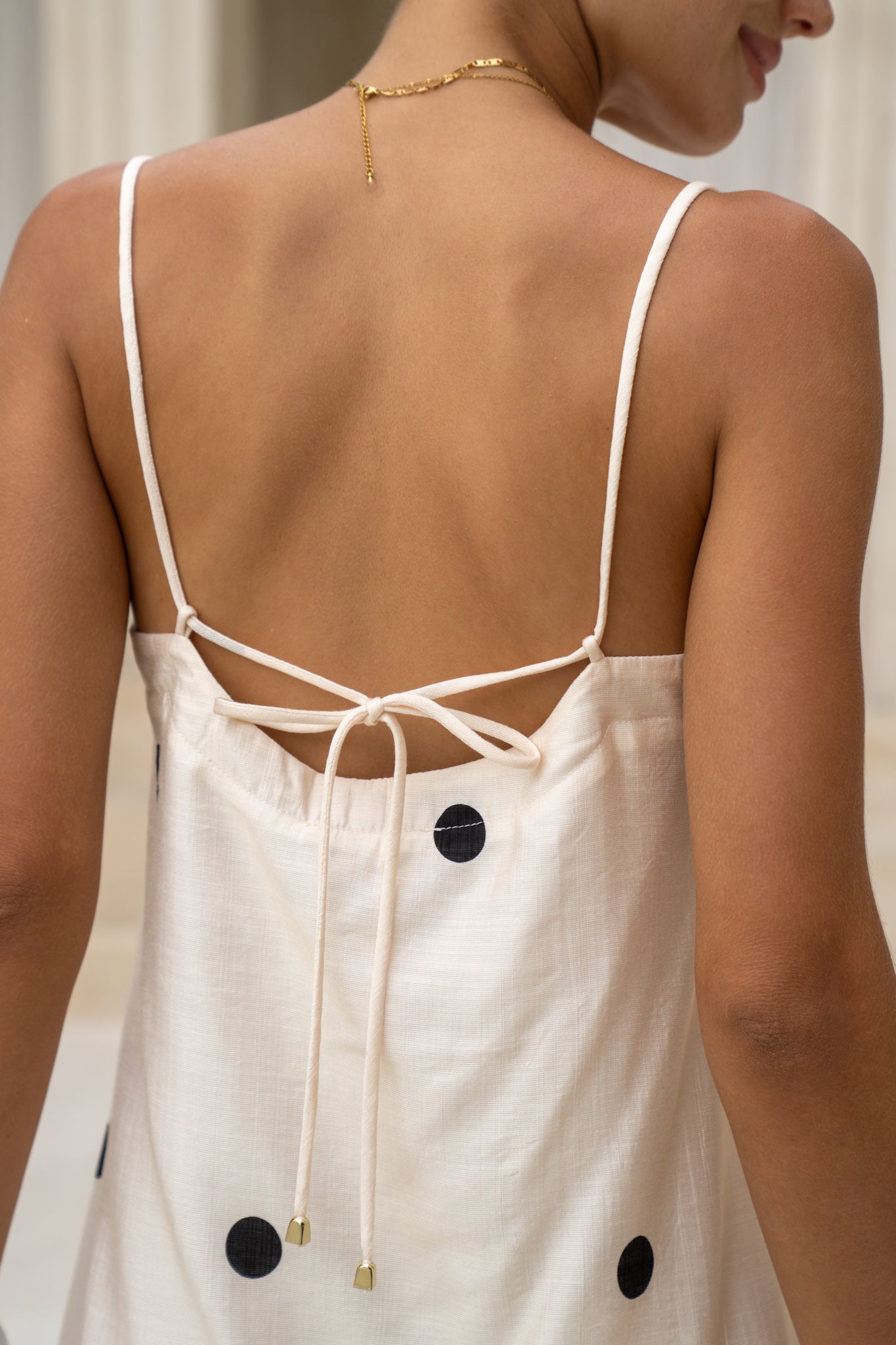 If joy had a dress, this might be it. The Yara Beige Black Polka Dot Mini Dress brings that sweet spot between cute and quietly confident. The silhouette is simple - a straight neckline, slender straps, and a relaxed shape that moves as you do. But then there are the details: the scattered black dots, bold yet balanced against a soft beige backdrop, turning a classic pattern into something refreshingly modern.